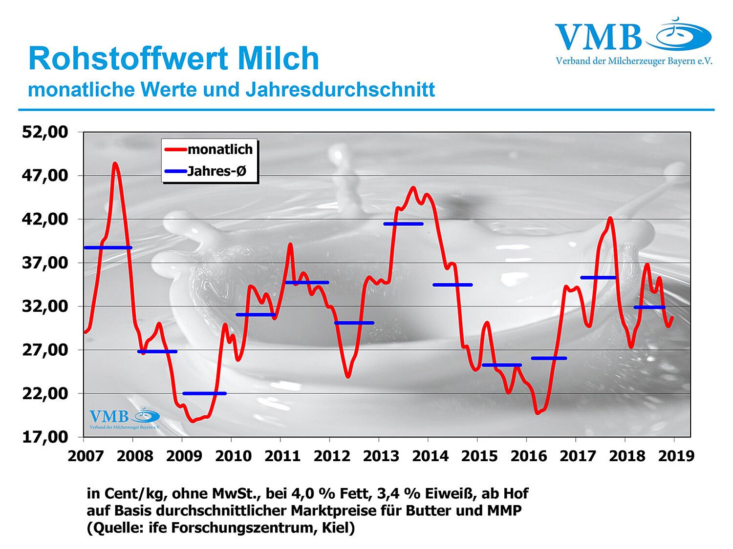 Der 10-Jahresmittelbetrag des Kieler Rohstoffwertes liegt (für die Kalenderjahre von 2008 bis 2018) bei 30,8 Cent/kg. Somit befindet sich der aktuelle Jahreswert bei 31,9 Cent/kg Milch, da heißt um 1,1 Cent über langfristigen Jahresvergleich.