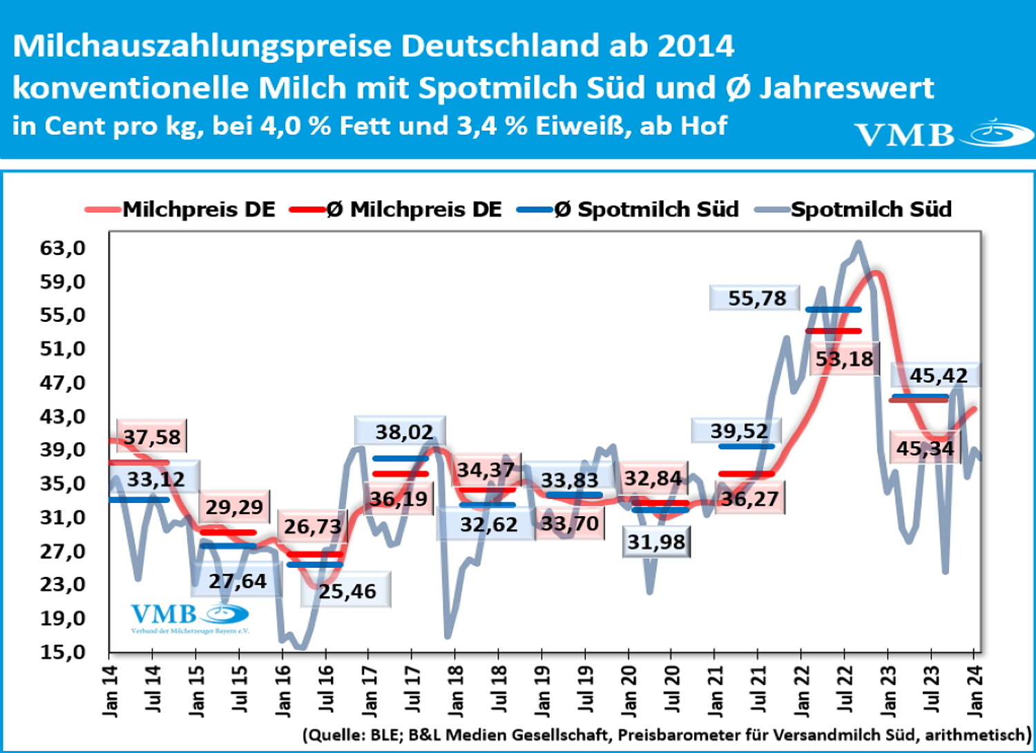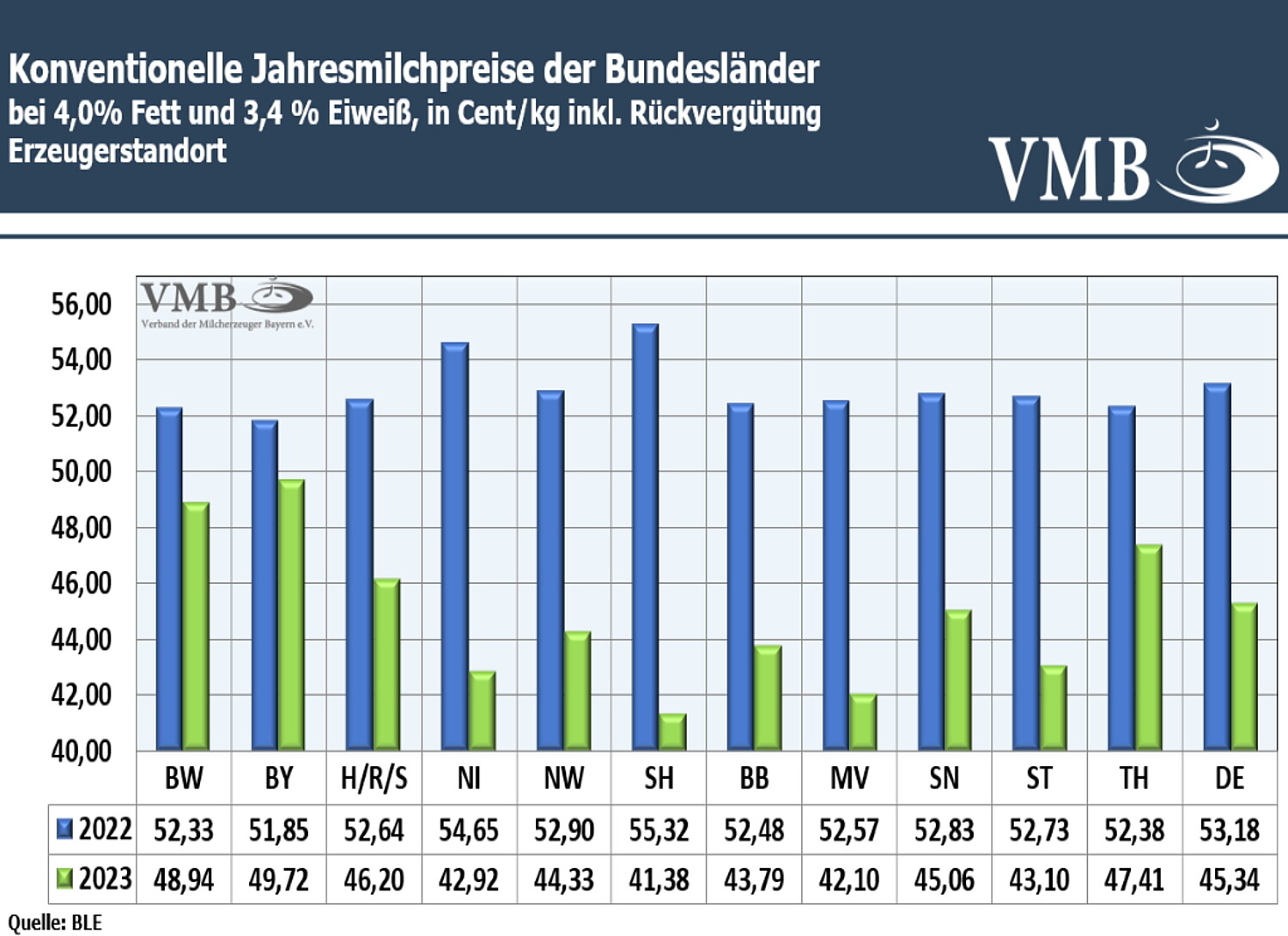 Im Jahr 2023 lag der bundesdeutsche durchschnittliche Milchpreis bei einer Höhe von 45,34 Ct/kg konventionell erzeugter Milch (4,0 % Fett, 3,4 % Eiweiß, netto ab Hof), inklusive der Nachzahlung. Dies ist ein Rückgang gegenüber dem Vorjahr von fast acht Cent bzw. ein Minus von 14,7 Prozent.