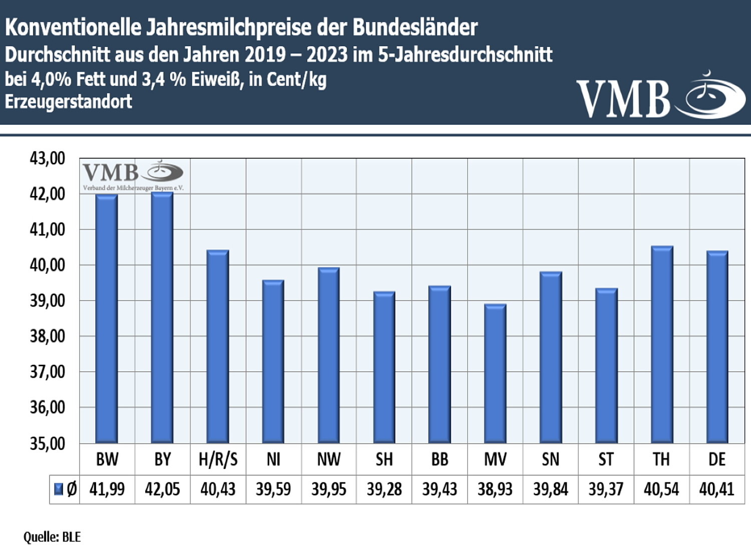 Nachdem die Commoditiesverwertungen (Butter, Milchpulver und Standardkäsesorten) im Frühjahr 2023 heftig von Marktturbulenzen und extremen Marktschwankungen getroffen wurden, sanken die Milchpreise bei Molkereien mit diesem Portfolio bereits Anfang des Jahres sehr rasant. Markenartikler konnten über einen gewissen Zeitraum das Preisniveau zeitversetzt verbessert halten. Entsprechend fiel daher der Jahrespreis und die Statistik der einzelnen Bundesländer für 2023 aus. Das Niveau sank von 56,93 Cent/kg Milch im Januar 2023 auf den Tiefststand im August 2023 von 40,39 Cent/kg Milch und stieg dann wieder Ende des Jahres 2023 auf 43,20 Cent/kg Milch.