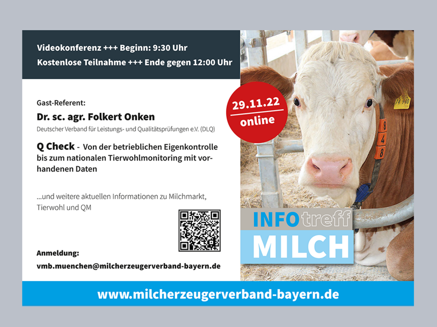 Der Termin findet am Dienstag, den 29.11. um 9:30 Uhr statt. Der Infotreff ist kostenlos und an Milcherzeuger:innen - vom Praktiker bis zum Ehrenamt in MEG, Genossenschaft oder Berufsstand - sowie an interessierte Verbraucher:innen gerichtet.