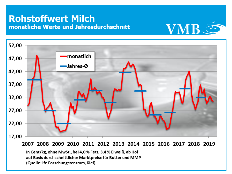 Das ife Institut hat für den Monat April 2019 eine Höhe von 30,6 Cent pro Kilogramm Milch (bei 4,0 % Fett und 3,4 % Eiweiß, netto ab Hof) ermittelt. Dies bedeutet gegenüber dem Vormonat März einen nochmaligen Rückgang von 0,3 Cent bzw. eine Reduzierung von fast einem Prozent.