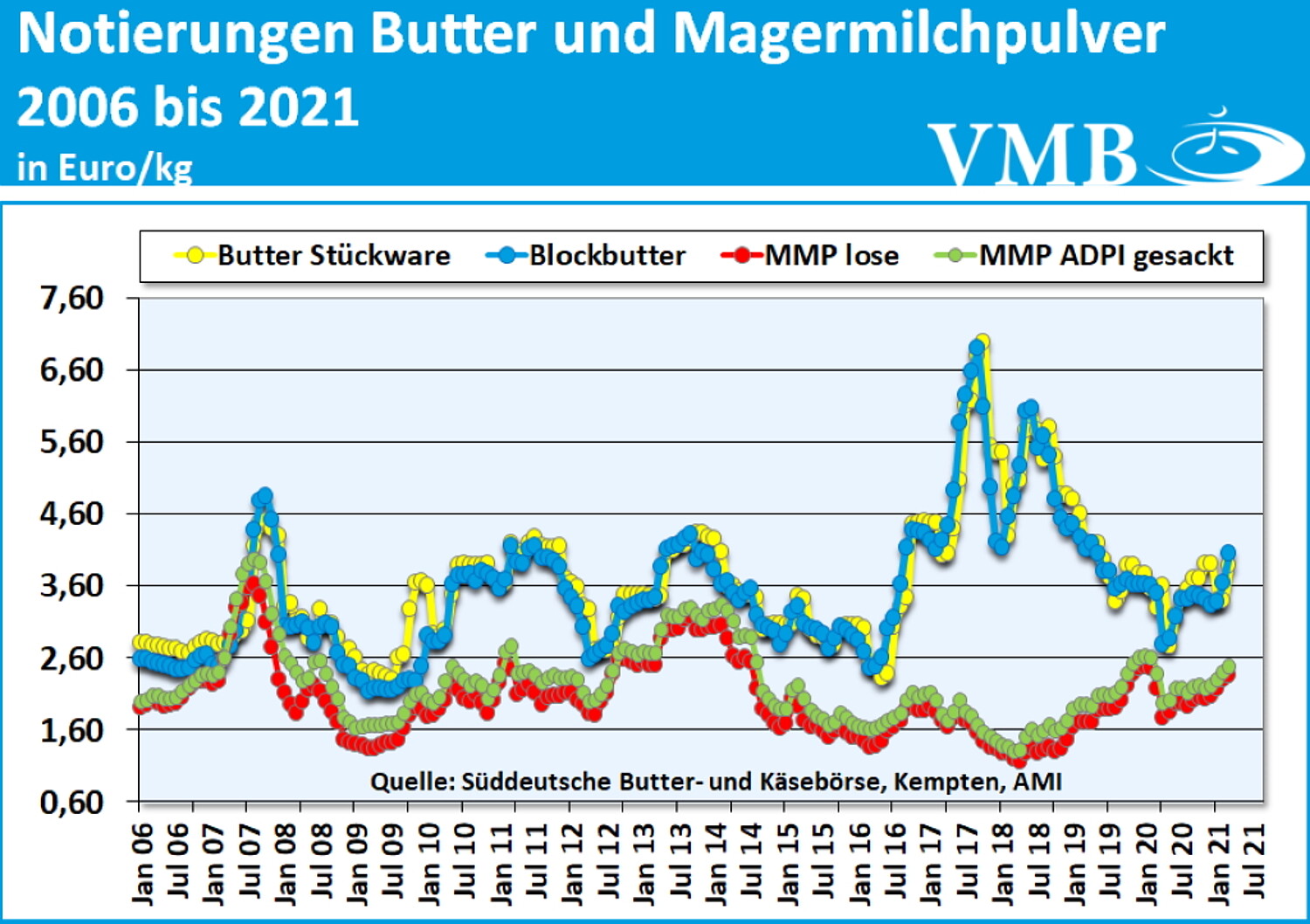 Die Anhebung des Kieler Rohstoffwertes wird durch eine gute Verwertung von Magermilchpulver ermöglicht. Magermilchpulver (Lebensmittelqualität, gesackt) erzielte im April 2021 im Schnitt 2,535 Euro je Kilogramm, im Vormonat wurden noch 2,478 Euro je Kilogramm ermittelt.