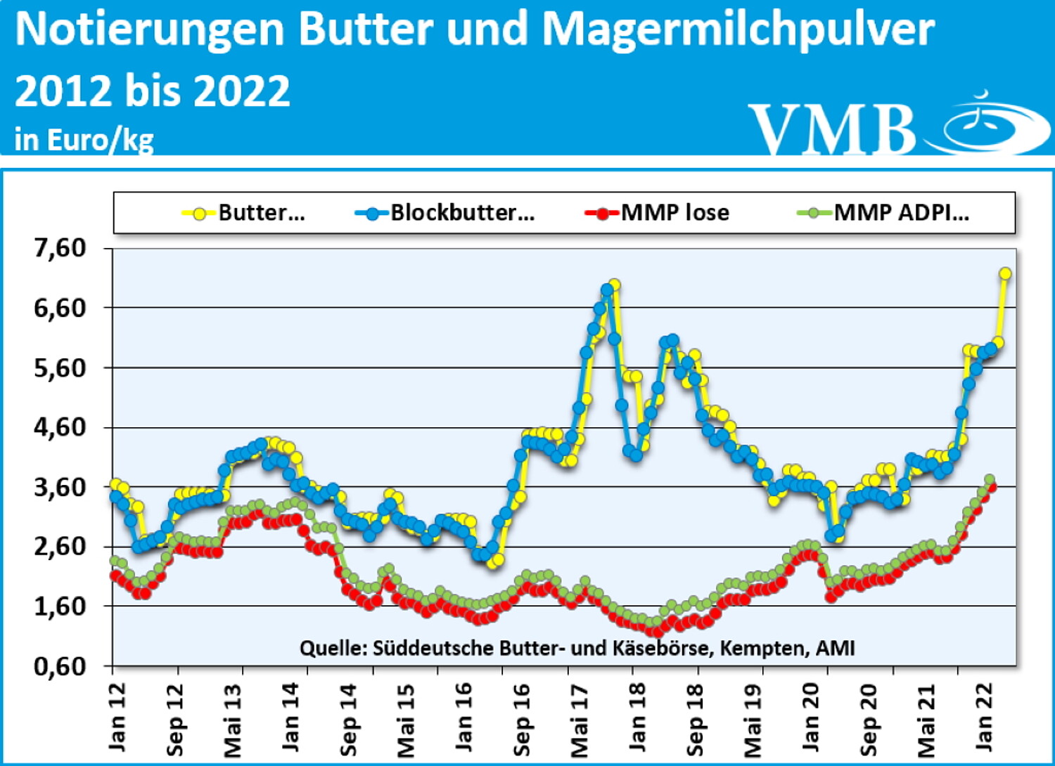Durch Überschreitung des KRW über die 60-Cent-Linie letzten Monat hat sich nun mit dem aktuellen Wert gezeigt, dass die derzeitige Marktstimmung hochgradig ausgeprägt ist. Trotz vieler Unsicherheiten in der Wirtschaft in Bezug auf die kriegerischen Auseinandersetzungen in Osteuropa, den extrem hohen Energiepreisen und den derzeitig heftigen Pandemiebestimmungen in China, welche den globalen Warentransfer maßgeblich beeinträchtigen, zeigt sich doch das Maßbarometer für Milchprodukte an der Messlatte positiv. Die Verarbeiterseite erfährt weiterhin Unterstützung gegenüber den Marktpartnern durch eine weiterhin rückläufige Milcherzeugung in Deutschland sowie in Europa.