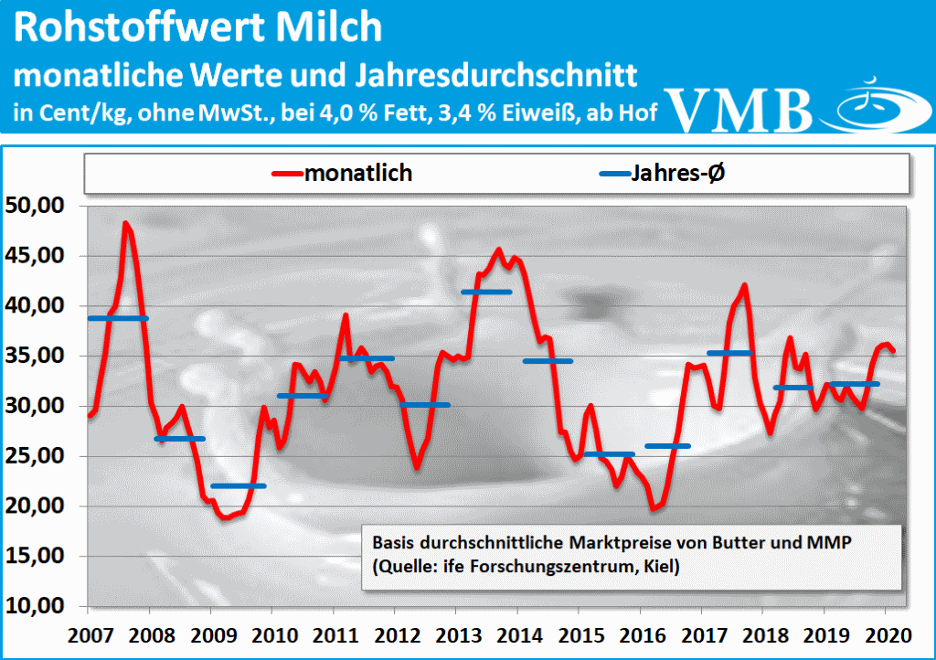 Für den Monat Februar 2020 veröffentlicht das ife Institut in Kiel einen Wert in Höhe von 35,5 Cent pro Kilogramm Milch (bei 4,0 % Fett, 3,4 % Eiweiß, netto, ab Hof). Dies bedeutet, dass sich der Betrag, gegenüber dem Vormonat Januar 2020, um 0,7 Cent reduziert hat. Damit errechnet sich bei der durchschnittlichen Standardverwertung von Milchfett und Eiweiß eine Verringerung um 1,9 Prozent.