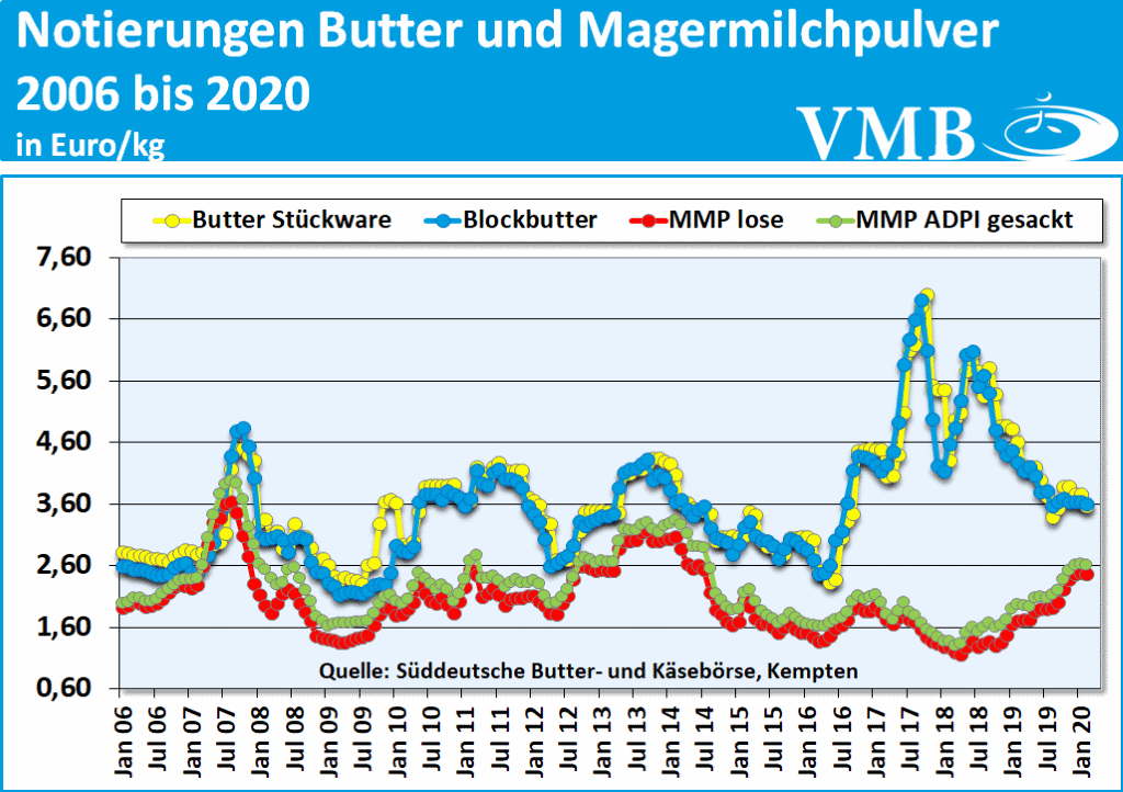 Obwohl die Marktbedingungen bei der Verwertung von Magermilchpulver und Butter zum Jahresanfang relativ gut gewesen sind, hat sich nun im Monat Februar 2020 die vormals erfreuliche Markttendenz etwas abgeschwächt. Die Marktbeobachter haben diesen Rückgang des Kieler Rohstoffwertes schon erwartet, da im Februar bei Butterfür die Verkaufspreise des Einzelhandels eine Reduzierung von 20 Cent pro Kilogramm Butter ausgehandelt wurde. Angesichts dieser Konstellation wurde schon damit gerechnet, dass der Kieler Rohstoffwert etwa einen halben Cent pro Kilogramm Milch verlieren könnte.