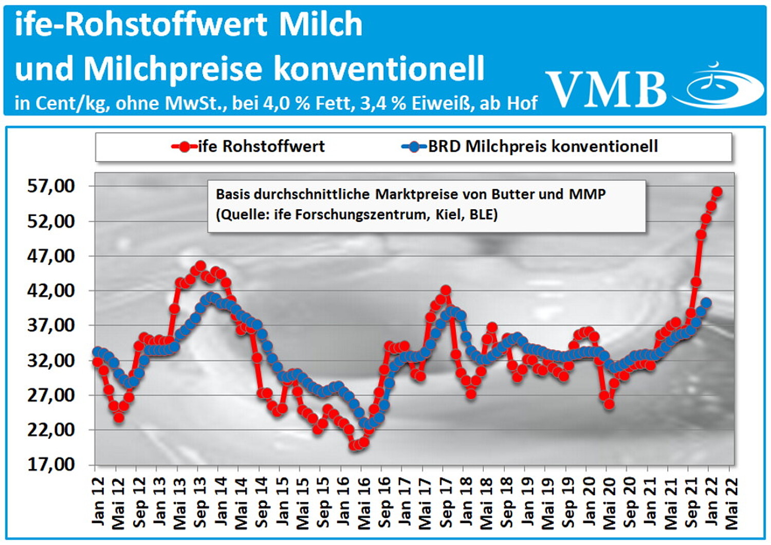 Der Milchmarkt ist in Bewegung und schreibt Milchpreise in erstaunlichen Dimensionen. Im Februar 2009 wurde vom Kieler Institut noch ein Wert von knapp unter 20 Cent pro Kilogramm Milch ermittelt. Dies ist ein Preisunterschied zum aktuellen Stand von über 46 Cent. Seit Beginn der Berechnung des Standardmilchpreises über die Verwertung von Butter und Milchpulver wurde für Februar 2022 der jemals höchste Wert ermittelt. Der Abstand zum Vorjahresmonat liegt bei 24 Cent pro Kilogramm Milch, dies ist ein Plus von 71 Prozent. Da in der Bewertung der aktuellen Notierung von Butter und Magermilchpulver an der Kemptener Butter- und Käsebörse auch für den kommenden Monate keine negative Preisentwicklungen zu erkennen sind, wird sich die Kalkulation des Kieler Rohstoffwertes wohl weiter an die 55-Cent-Linie halten können. Inwieweit die Markteinflüsse über die derzeit politische Krise und etwaige kriegerische Auseinandersetzung aussehen werden, kann momentan schwer abgeschätzt werden. Die Kosten für Energie sind sprunghaft angestiegen und beeinflussen heftig die Inflationsrate und somit auch das Konsumverhalten der Verbraucher.