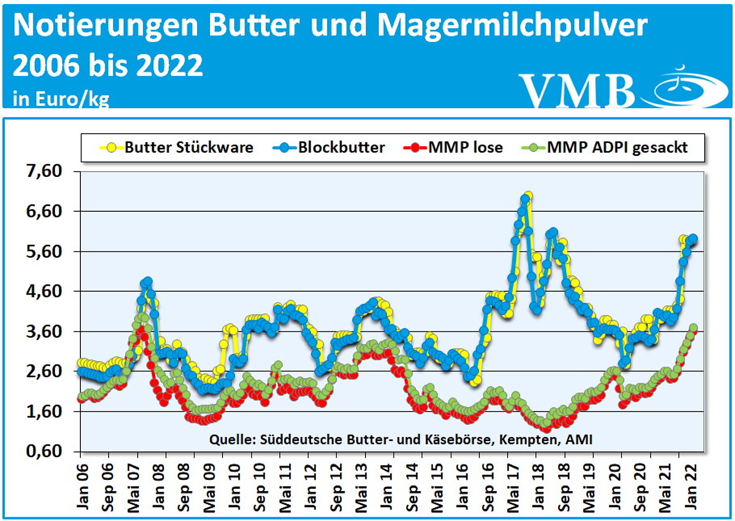 Der nochmalige Anstieg des Kieler Rohstoffwertes von zwei Cent begründet sich im Wesentlichen durch die Erhöhung des Marktpreises von Magermilchpulver (MMP). Um knapp zwanzig Cent stieg der Preis für MMP auf durchschnittliche 3,65 €uro für ein Kilogramm. Stellt man den Preis des Vorjahres gegenüber, konnte sich der Preis um gut 1,30 €uro verbessern. Auch die Butterverkäufe verzeichneten im Februar 2022 höhere Erlöse. Dieser Anstieg verlief jedoch geringer als bei Milchpulver. Die durchschnittliche Erhöhung bei Butter beträgt circa fünf Cent pro Kilogramm. Hier liegt die Preisverbesserung zum Vorjahr bei 1,50 €uro pro Kilogramm.