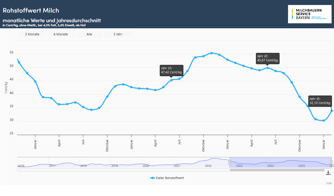 Erstmals seit Juni 2025 drehte der Kieler Rohstoffwert im Februar dieses Jahres wieder ins Plus. Von Januar 2025 bis zum Januar 2026 verlor der Rohstoffwert spürbar um 22,6 Cent bzw. 43 %. Mit der Veröffentlichung des Kieler Instituts für Ernährungswirtschaft e.V. für Februar mit 33,9 Cent/kg Milch (ab Hof 4,0 % Fett und 3,4 % Eiweiß) konnte der Rohstoffwert um 3,6 Cent oder 11,2 % gegenüber dem Januar zulegen. Der Rückstand zum Vorjahresmonat schrumpfte dadurch etwas, lag aber mit einem Minus von 17,8 Cent/kg deutlich darunter. Der Abwärtstrend in der Rohstoffverwertung hat seitdem Monatswechsel ein Ende genommen, insbesondere in der Eiweißverwertung verbesserte sich die Erlössituation.