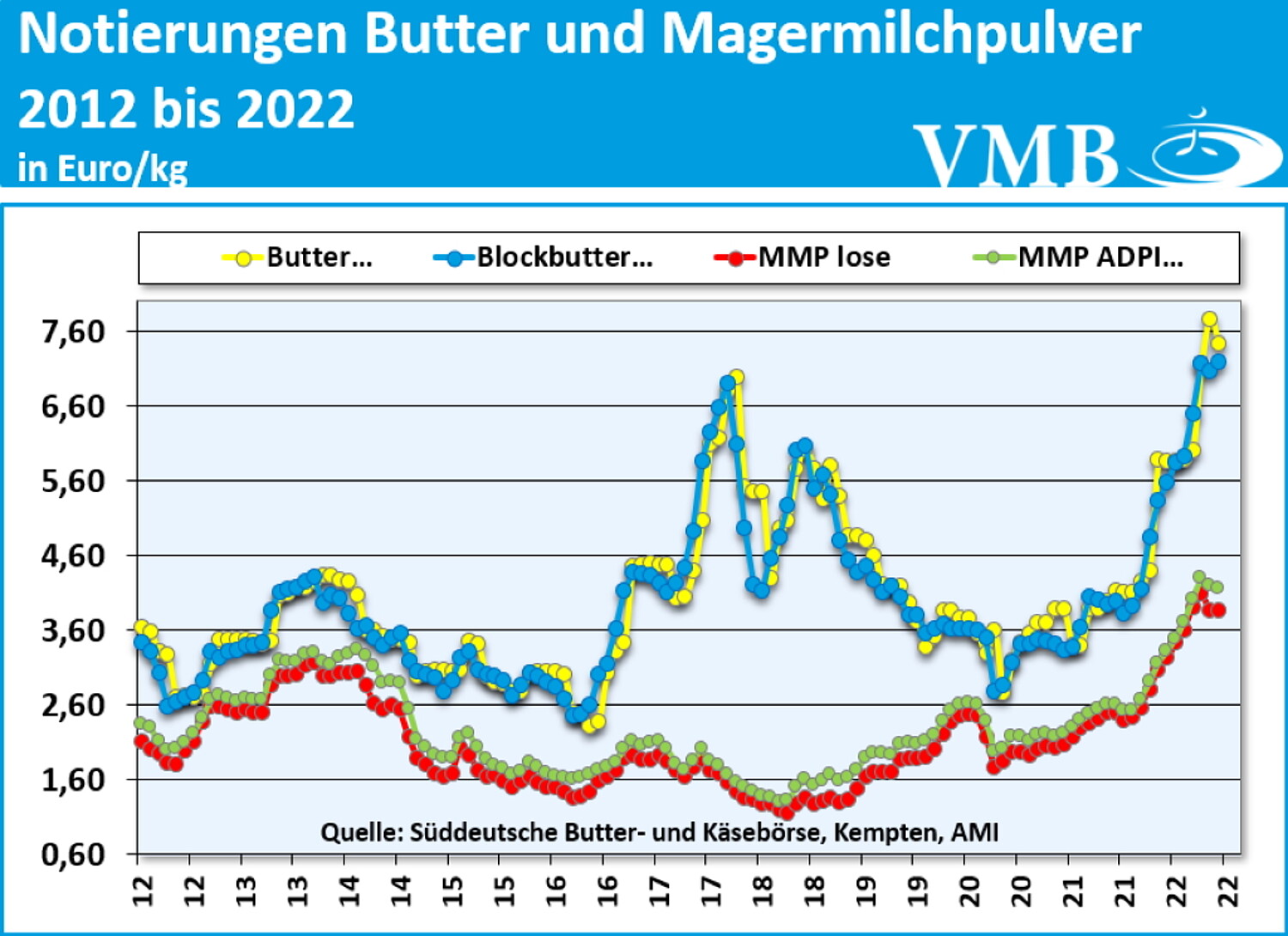 Das Institut für Ernährungswirtschaft, Kiel (ife) berechnet aus den Notierungswerten von Butter und Magermilchpulver (MMP) der Süddeutschen Butter- und Käsebörse, Kempten, den sogenannten Kieler Rohstoffwert (KRW). Dieser Wert entspricht der durchschnittlichen Milchverwertung aus dem Verkauf von Milchfett und Milcheiweiß. Der Rohstoffwert (KRW) des Kieler Instituts hat im Juni 2022 beharrt trotz einer schwächeren Marktentwicklung bei Butter und Magermilchpulver weiterhin auf einer Höhe von über 60 Cent/kg Milch. Wie das Institut aktuell gemeldet hat, liegt der Wert bei 63,8 Cent pro Kilogramm Milch (bei 4,0 % Fett, 3,4 % Eiweiß, netto, ab Hof). Im Vergleich zum Resultat des zurückliegenden Monats mit einem Wert von 65,8 Cent, bedeutet dies eine Absenkung um zwei Cent pro Kilogramm Milch. Prozentual ausgedrückt ergibt dies einen Rückgang von drei Prozent.