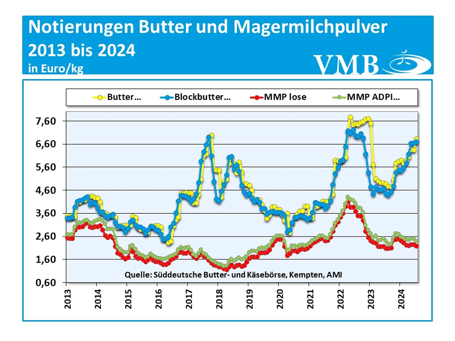 Nachdem sich im August das Angebot an Milchfett verknappt hat und sich die Verfügbarkeit an Rahm und Sahne weiter zuspitzte, sind die Kurse für Butter spürbar gestiegen. Die Abgabepreise an den Großhandel erhöhten sich um durchschnittlich 50,5 Cent auf 7,27 Euro/kg Butter gegenüber Juli. Der lebhaften Nachfrage nach Butter kann derzeit wenig entgegengesetzt werden. Neben dem schwächeren Fettgehalt in der Rochmilchanlieferug bewegen sich die Lagerbestände an Butter auf niedrigem Niveau. Zudem erforderte auch ein erhöhter Absatz an Käse einen zunehmenden Fettbedarf. Mit Beginn des Herbstgeschäfts dürfte sich kurzfristig kaum etwas an dieser Marktsituation ändern, die Versorgungslage wird herausfordernder. Am Spotmarkt hatten die Kurse für Industriesahne die Linien von 9 Euro/kg Fett durchbrochen und stehen mit dem Monatswechsel kurz vor dem Sprung über die 10 Euro-Marke. Im Absatz von Magermilchpulver verbesserten sich die Erlöse hingegen nur langsam. Mit durchschnittlich 2,34 Euro/kg wurde das Ergebnis vom Juli nur leicht übertroffen (+ 5 Cent/kg). Mit abnehmender Rohstoffverfügbarkeit dürfte auch das Angebot an Magermilchpulver schrumpften.