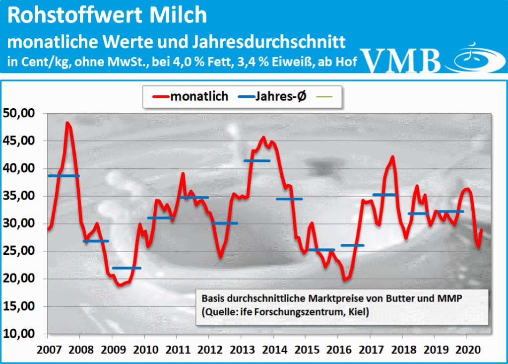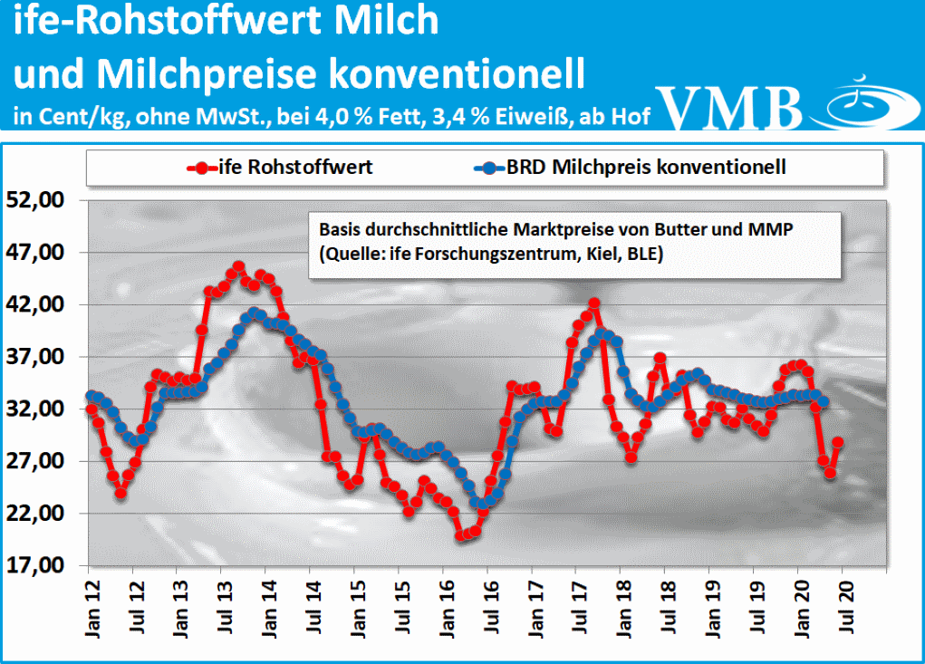 Für den Monat Juni 2020 hat das ife Institut in Kiel einen Wert in Höhe von 28,8 Cent pro Kilogramm Milch (bei 4,0 % Fett, 3,4 % Eiweiß, netto, ab Hof) veröffentlicht. Dies bedeutet, dass sich die Höhe des Kieler Rohstoffwertes, gegenüber dem Vormonat Mai 2020, um 3,0 Cent pro Kilogramm Milch erhöht hat. Damit ergibt sich, im Vergleich zum zurückliegenden Monat, bei der durchschnittlichen Standardverwertung von Milchfett und Eiweiß, eine deutliche Erhöhung in Höhe von 11,6 Prozent.