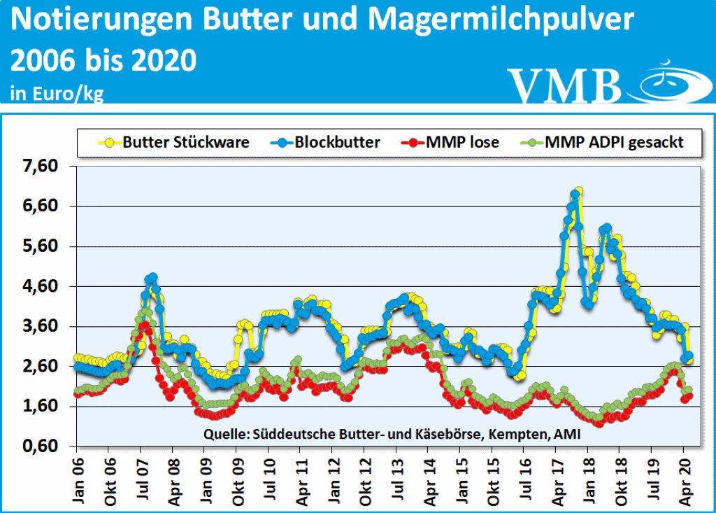 Erfreulicherweise sind es genau diese Verwertungen, die im letzten Monat die Reduzierung des Kieler Rohstoffwertes verursachten, die nun eine Kehrtwende in ihrer Vermarktung erreicht haben. Im Vergleich zum Vormonat konnte die geformte Butter um fast 40 Cent pro Kilogramm teurer verkauft werden. Zeitgleich haben sich die Erlöse der Butter-Blockware ebenfalls erhöht. Diese Preisverbesserungen hätten den Kieler Rohstoffwert normalerweise um ein bis zwei Cent aufgewertet. Da aber nun, infolge der Beendigungen von mehreren Pandemie-Beschränkungen, die internationalen Märkte wieder gestartet sind, konnten die klassischen Milchprodukte im Ausland wieder mehr und im Preis erhöhter abgesetzt werden. Demzufolge sind auch die Erlöse im Milchpulversegment ebenfalls um gut 10 Cent pro Kilogramm angestiegen. In Anbetracht dieser beiden Marktdaten, hat sich der Kieler Rohstoffwert von 3,0 Cent auf 28,8 Cent pro Kilogramm Milch verbessert. Da Ende Juni 2020, die Handelspreise von Butter und Magermilchpulver sich weiter als fest erweisen, kann nicht ausgeschlossen werden, dass die Milchpreishöhe der Standardverwertung von Milchfett und Milcheiweiß sich nicht verändert aber eventuell auch bald die 30-Cent-Linie erreichen könnte.