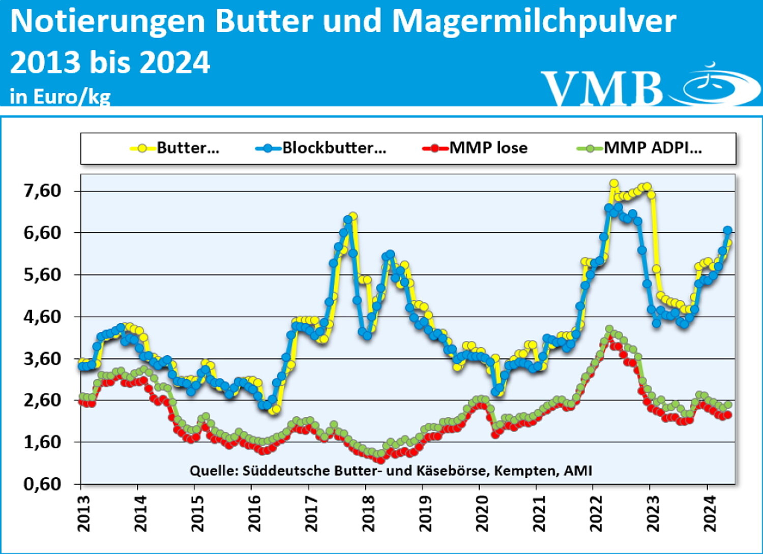 Die Standardverwertung bei Milch hatte sich im Juni nochmals verbessert. Hauptsächlich die Erlössituation am Fettmarkt entwickelte sich im Juni sehr dynamisch und legte nach einer bereits festeren Preisentwicklung im Vormonat merklich zu. Butter erlöste im Großhandel mit durchschnittlich 6,49 Euro/kg um 43,2 Cent/kg mehr als im Mai - ein Plus von gut 7 %. Geringere Fettgehalte in der Rohmilch begrenzten die Produktion von Butter. Trotz der saisonalen Spitze in der Milchanlieferung konnten sich die bereits niedrigen Bestände an Butter nicht wesentlich erholen. Die Verwertung von Magermilchpulver erhielt im Juni kaum Impulse. Entsprechend moderat entwickelten sich auch die Abgabepreise, im Schnitt wurde nur eine sehr moderate Veränderung von 5 Cent/kg gegenüber dem Vormonat ausgewiesen. Das Kilogramm Magermilchpulver erhöhte sich somit auf 2,36 Euro/kg.