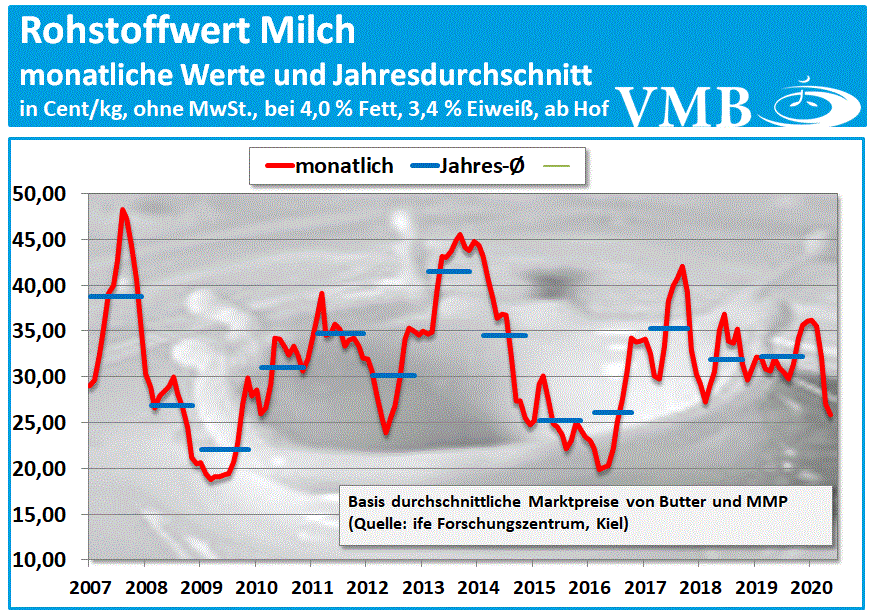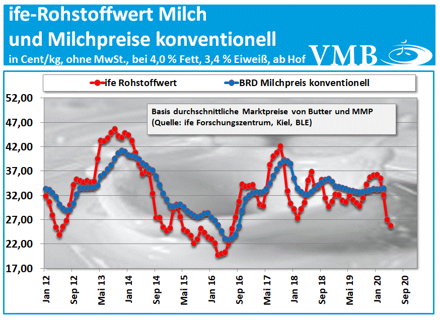 Für den Monat Mai 2020 hat das ife Institut in Kiel einen Wert in Höhe von 25,8 Cent pro Kilogramm Milch (bei 4,0 % Fett, 3,4 % Eiweiß, netto, ab Hof) veröffentlicht. Dies bedeutet, dass sich die Höhe des Kieler Rohstoffwertes, gegenüber dem Vormonat April 2020 um 1,2 Cent pro Kilogramm Milch reduziert hat. Damit ergibt sich, im Vergleich zum zurückliegenden Monat, bei der durchschnittlichen Standardverwertung von Milchfett und Eiweiß eine deutliche Einbuße in Höhe von 4,4 Prozent.