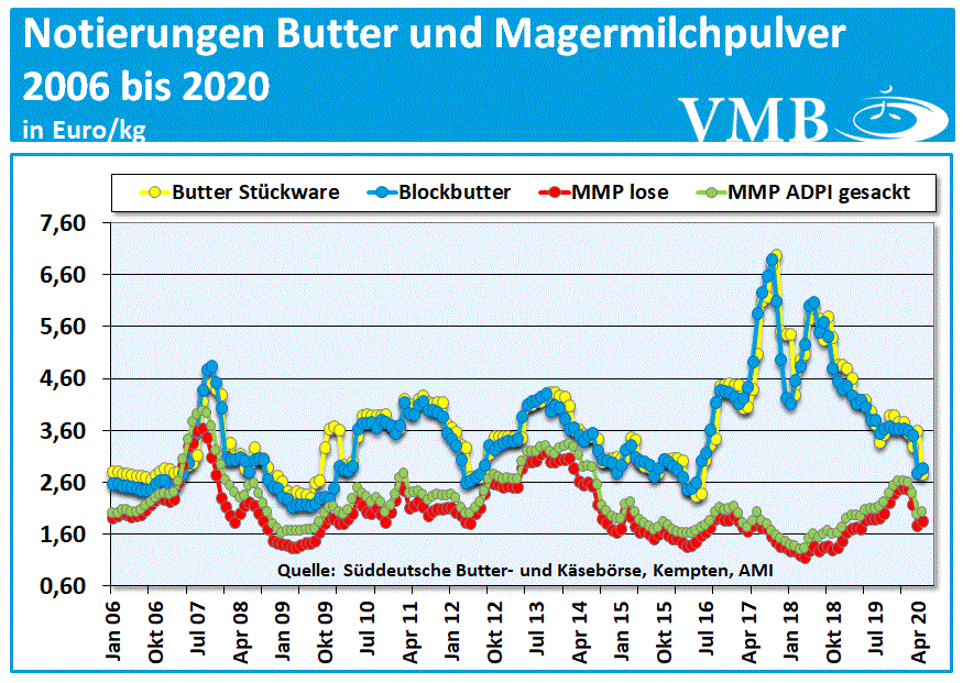 Auch die Magermilchpulverpreise haben zusätzlich an Wert verloren, da die gewohnten Absatzkanäle nicht zur Verfügung standen. Etwas Verbesserung versprach die zweite Maihälfte. Da so langsam die Markthemmnisse sowie auch die Kontaktsperren aufgehoben wurden, konnte sich auch die Lage des Milchmarktes generell etwas entspannen. Mehr Exportmöglichkeiten und schließlich die Öffnungen von Hotels und Gastronomie haben den Absatz und das Preisgefüge gefestigt. Zum Monatsende konnte Magermilchpulver um gut 15 Cent pro Kilogramm höher verkauft werden. Zur letzten Notierungswoche im Mai erreichten die Blockbutterpreise noch den Sprung über die Drei-Euro-Grenze. Durch den Monatskontrakt mit dem Lebensmitteleinzelhandel verharren die Butter-Stückwarenpreise auf einer Höhe von durchschnittlich 2,72 Euro pro Kilogramm.