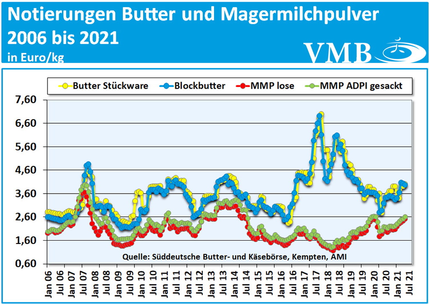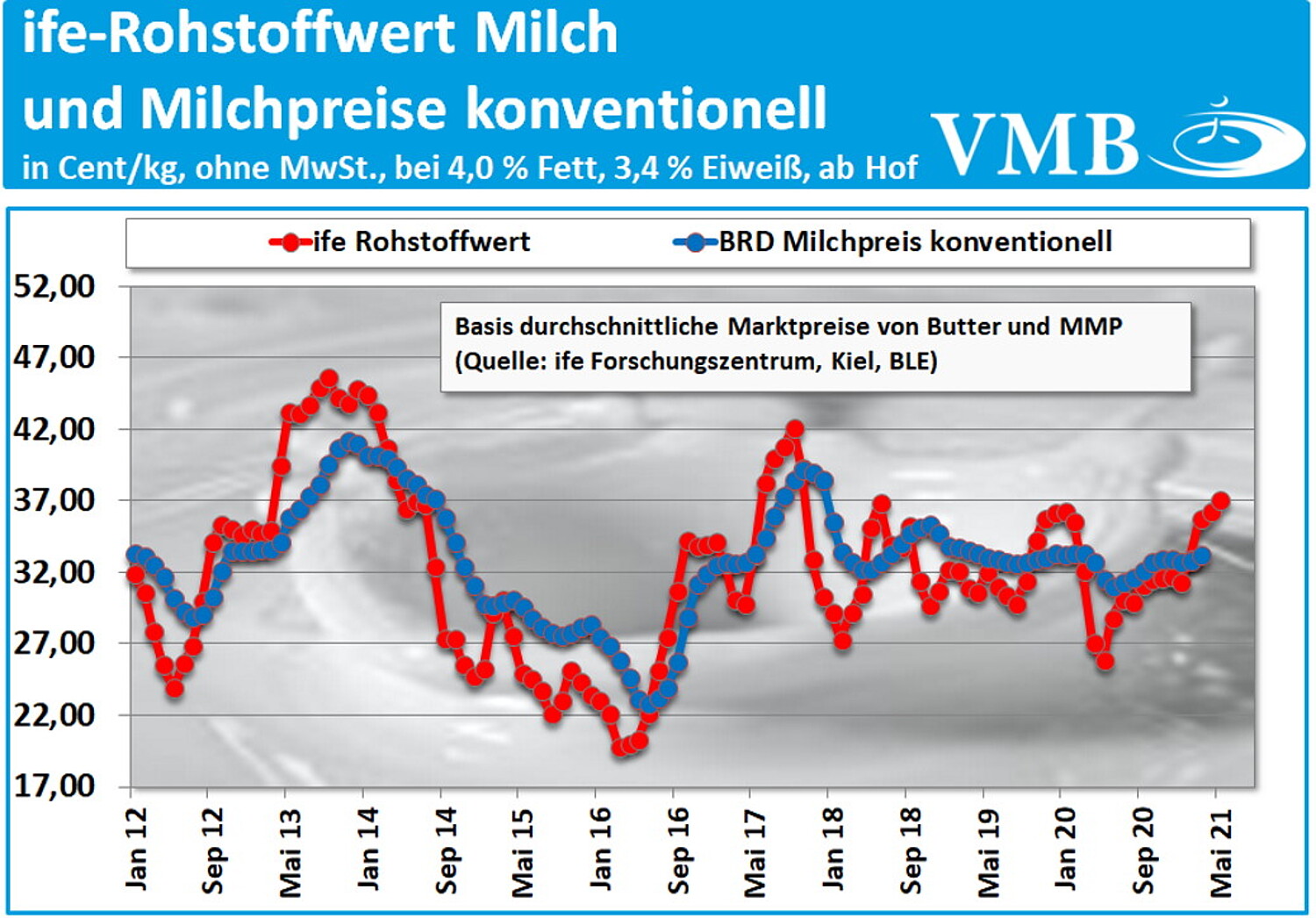 Die Anhebung des Kieler Rohstoffwertes wird von besseren Verwertungen bei Magermilchpulver und Butter getragen. Im Schnitt erzielte Butter Preiserhöhungen von gut 10 Cent pro Kilogramm und auch die Verwertung von Magermilchpulver (Lebensmittelqualität, gesackt) erlangte im Mai 2021 im Schnitt rund sieben Cent pro Kilogramm mehr als im Vormonat. Wenn der Kieler Rohstoffwert 2021 diese tendenzielle Richtung beibehält, wird der Halbjahreswert die 35-Cent-Linie überschreiten. Dieser Durchschnittswert konnte letztmalig in den Jahren 2013 und 2014 überschritten werden.