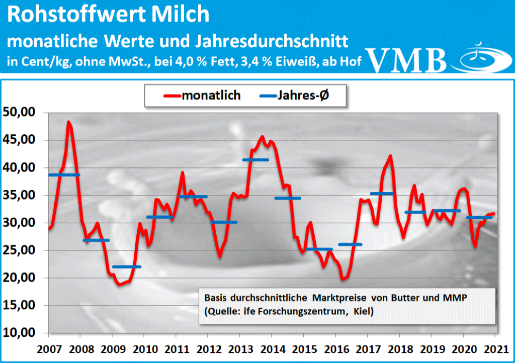Die heftigste Preisbewegung offenbarte sich in der ersten Jahreshälfte. Da sich, mit Beginn des zweiten Halbjahres 2020, die Märkte wieder stabilisiert haben, konnte sich nun auch der Milchpreis erholen. Im Januar 2020 erreichte die Verwertung von Milchfett und Milchpulver noch einen Preis von 36,20 Cent pro Kilogramm Milch. Im Monat Mai 2020 reduzierte sich die Milchverwertung um über 10 Cent und wies nun nur noch einen Wert in Höhe von 25,80 Cent pro Kilogramm Milch auf. Danach erfolgte eine Markterholung und der Kieler Rohstoffwert konnte in kleinen Schritten bis zum Jahresende 2020 auf 31,70 Cent pro Kilogramm Milch ansteigen. Damit errechnet sich ein Jahreswert für 2020 in Höhe von 30,94 Cent pro Kilogramm Milch. Dieser Jahreswert liegt um 1,26 Cent bzw. 3,9 Prozent unter dem Vorjahresergebnis 2019 von 32,20 Cent pro Kilogramm Milch.