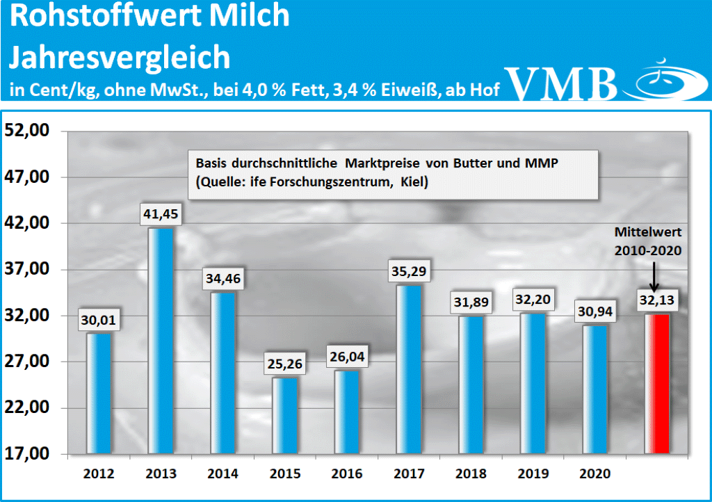 Für den Monat Dezember 2020 hat das ife Institut in Kiel einen Betrag von 31,7 Cent pro Kilogramm Milch (bei 4,0 % Fett, 3,4 % Eiweiß, netto, ab Hof) veröffentlicht. Gegenüber dem Vormonat November 2020, hat sich der Wert nur unwesentlich um 0,1 Cent verändert. Demzufolge beträgt der prozentuale Anstieg der durchschnittlichen Standardmilchfett- und Eiweißverwertung 0,3 Prozent. Zusammen mit dem Dezemberwert in Höhe von 31,7 Cent pro Kilogramm, ergibt sich somit ein Jahresmilchpreis von 30,94 Cent pro Kilogramm Milch.