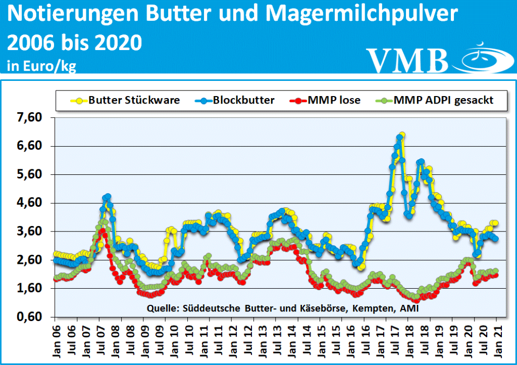 Auf den Märkten hat, vor allem in der ersten Jahreshälfte 2020, die weltweite verbreitete Corona-Pandemie allgemein aber speziell auch in der Landwirtschaft deutliche Spuren hinterlassen. Auf den Milchmärkten reagierten zuerst die globalen Handelspreise und später auch die inländischen Werte. Infolgedessen wurden anfänglich die Erlöse fast aller Milchprodukte reduziert. Auch die Butter- und Magermilchverwertungen verloren mitunter deutlich an Höhe. Im Durchschnitt sanken somit die Preise von Butter und Magermilchpulver bis Mitte des Jahres 2020 um 1 Euro bzw. um 0,60 Euro pro Kilogramm. Diese Entwicklung zeigt sich auch in der Grafik der durchschnittlichen Jahreswerte des Kieler Rohstoffwertes.