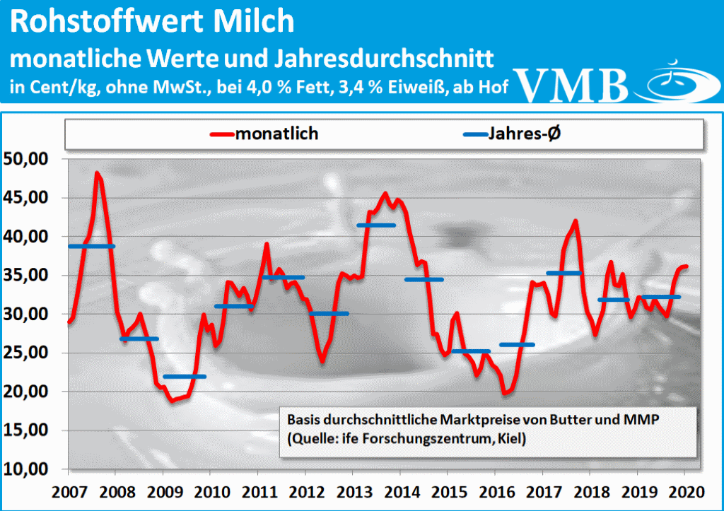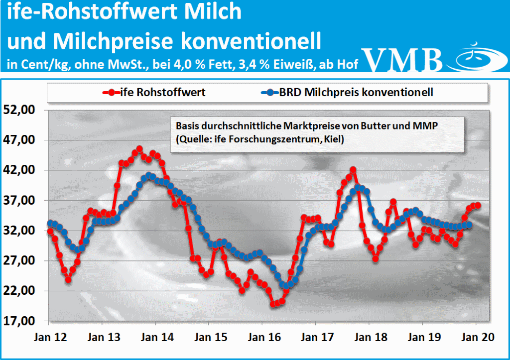 Das ife Institut in Kiel hat für den Monat Januar 2020 einen Betrag von 36,2 Cent pro Kilogramm Milch (bei 4,0 % Fett, 3,4 % Eiweiß, netto, ab Hof) veröffentlicht. Gegenüber dem Vormonat Dezember 2019 hat sich damit der Wert nur geringfügig um 0,1 Cent erhöht. Somit beträgt der Anstieg bei der durchschnittlichen Standardverwertung von Milchfett und Eiweiß annährend 0,3 Prozent.