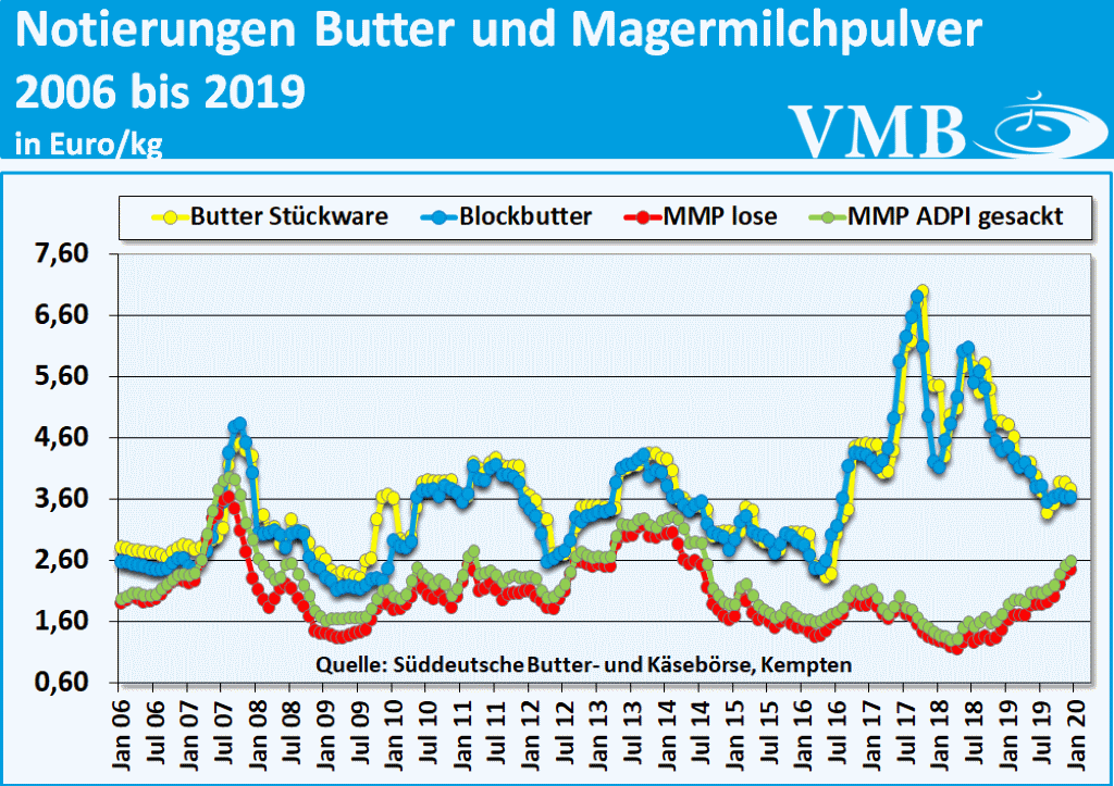 Zugleich hat, infolge einer erhöhten Milchfettproduktion, das Angebot von Butter zugenommen. Allerdings hat die Exportbilanz des vergangenen Jahres 2019 gezeigt, dass mit den derzeitigen Milchfettpreisen, auf dem internationalen Parkett eine höhere Konkurrenzfähigkeit besteht, so dass die vorläufige Exportbilanz von Milchfett mit einem Plus von 50.000 bis 60.000 Tonnen das Jahr 2019 abschließen wird. Infolgedessen kann davon ausgegangen werden, dass im internationalen Bereich eine Stabilisierung des Marktes auch bei Milchfett stattfinden wird. Auch das Niveau des heimischen Marktes wird sich an der derzeitigen Höhe messen. Nach den derzeit bestehenden Marktparametern ist davon auszugehen, dass der Kieler Rohstoffwert des Ife Institutes auch im kommenden Monat sich ungefähr um dieses Niveau bewegen wird, bevor dann zu Beginn des 2. Quartals 2020 bei fast allen Milchproduktbereichen der Milchprodukte neu verhandelt wird.