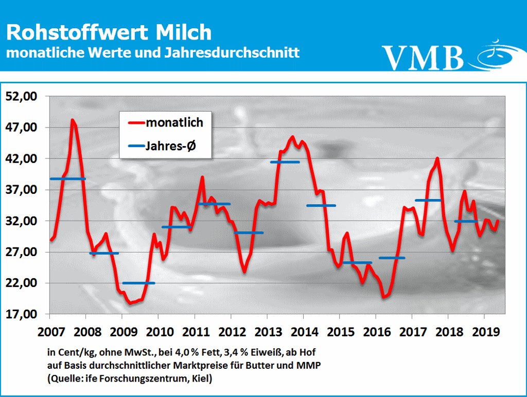 Für den Monat Mai 2019 hat das ife Institut eine Höhe von 32,00 Cent pro Kilogramm Milch (bei 4,0 % Fett und 3,4 % Eiweiß, netto, ab Hof) ermittelt. Dies bedeutet gegenüber dem zurückliegenden Monat April 2019 einen Anstieg von 1,4 Cent bzw. eine Erhöhung von 4,6 Prozent.