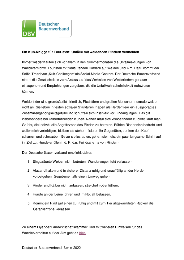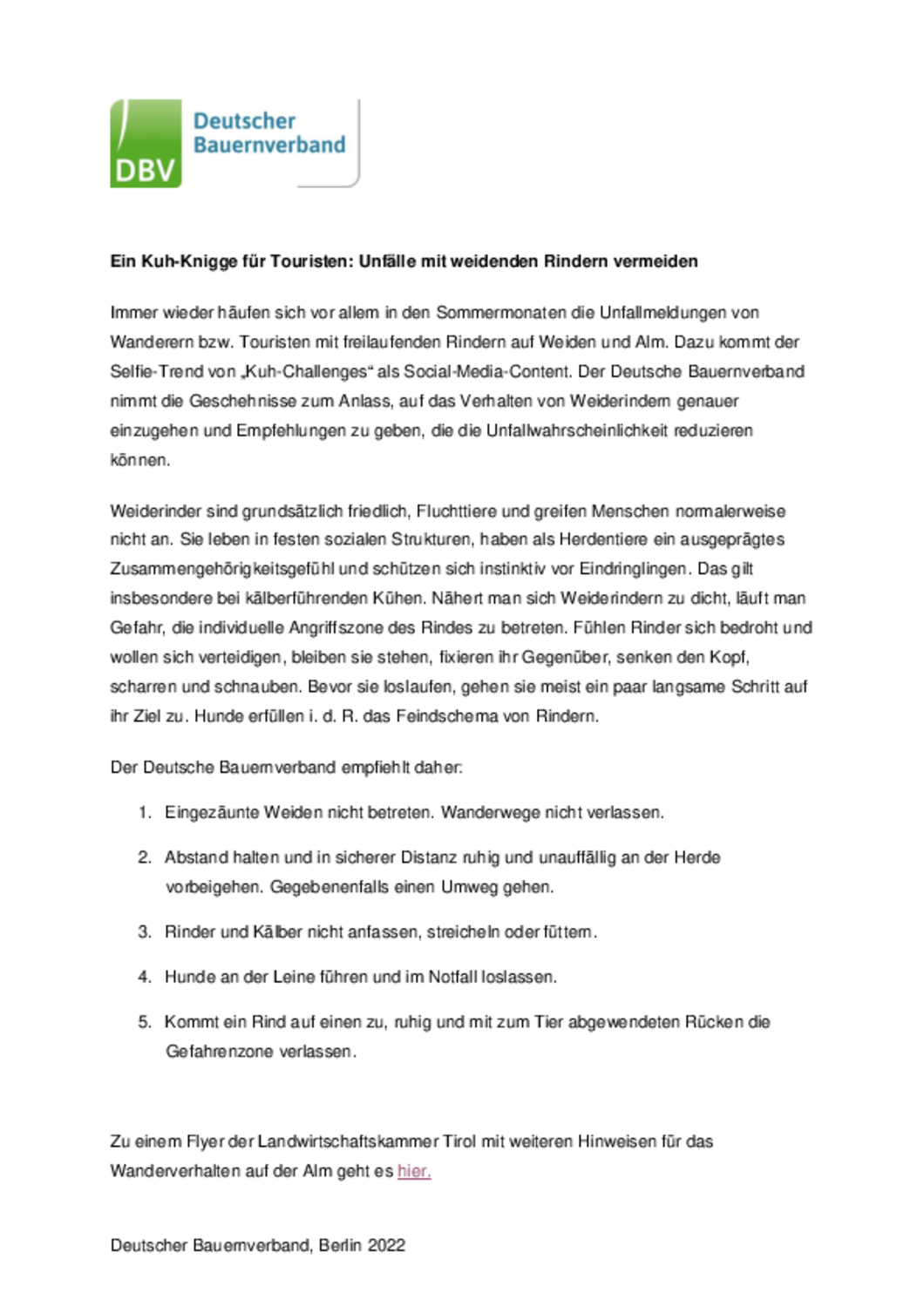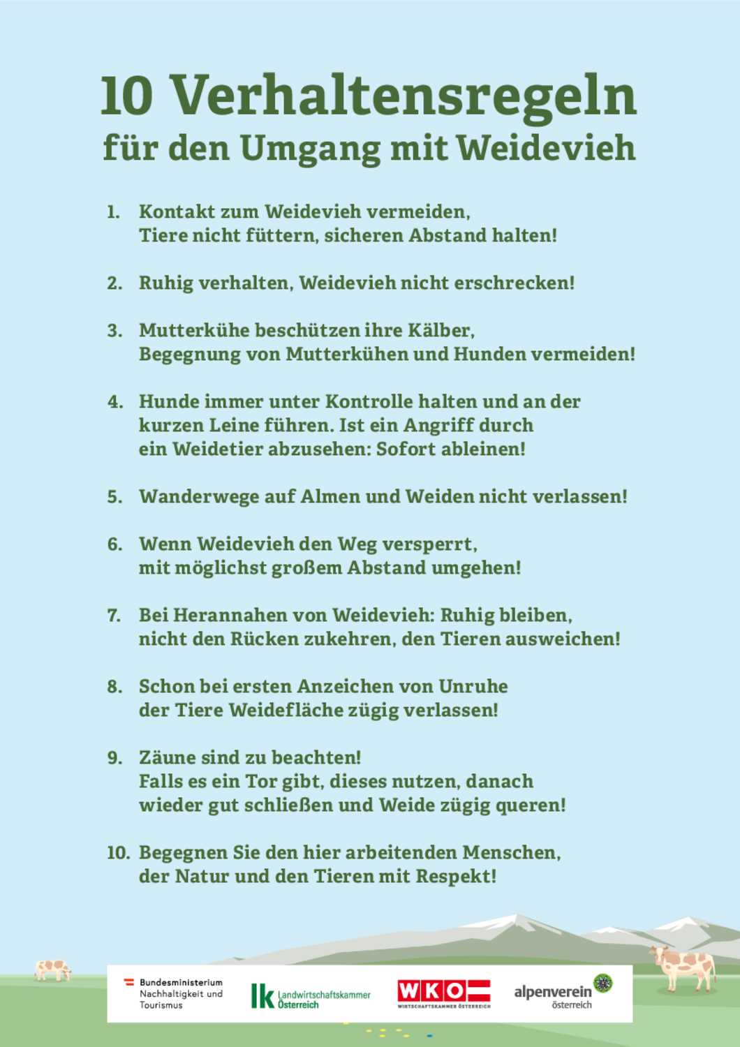 Bei aller Tragik bei einem diesmal recht glimpflichen Ausgang: Das Fehlverhalten lag wieder einmal beim Menschen und nicht bei der wahrscheinlich friedlich grasenden oder auch nur neugierig agierenden Kuh. Und dass sich eine gesunde Kuh noch bewegt, ist doch ebenso normal und erfreulich wie die Tatsache, dass sie sich dabei auch nichts "denkt". Auf jeden Fall sollte der Vorfall erneut Anlass sein, auf den Umgang mit Nutztieren hinzuweisen: Ratgeber gibt es spätestens seit tödlich verlaufenen Unfällen zuhauf, vor allem seitens der jeweiligen Verantwortlichen vor Ort. (siehe unter dem Text)
