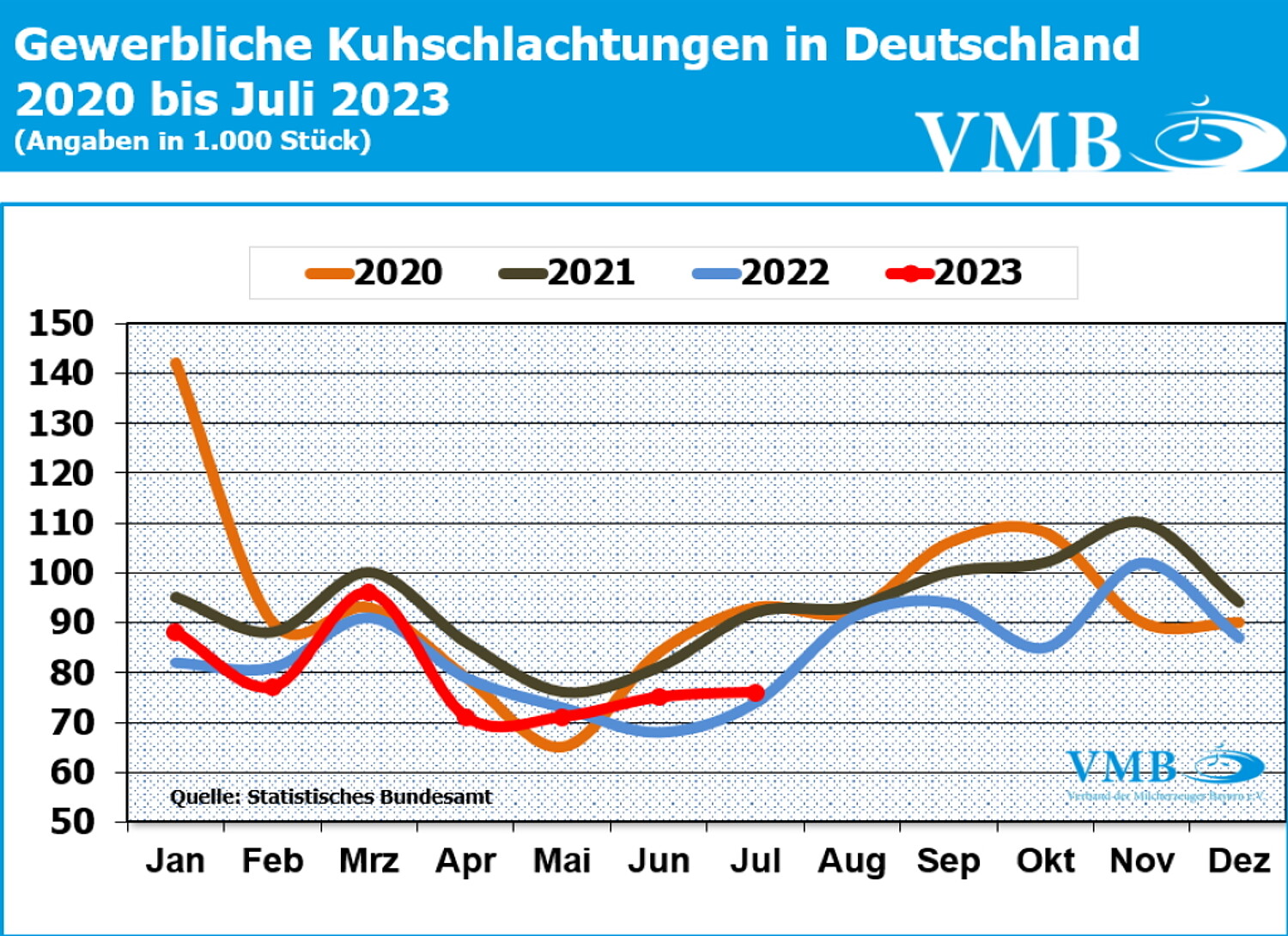Das Statistische Bundesamt erhebt zeitnah allgemein die Schlachtzahlen in Deutschland. Auch Rinderschlachtungen bzw. hier die Kuhschlachtungen werden stetig neu herausgegeben. Die laufende Erhebung des Bundesamtes für Schlachtkühe in Deutschland ermittelt zur Jahresmitte 2023 wieder eine Erhöhung der Schlachtzahlen als noch zu Jahresbeginn. Die laufend fallenden Milchpreise haben in diesem Jahr dazu geführt, dass mehr Altkühe abgegeben werden.