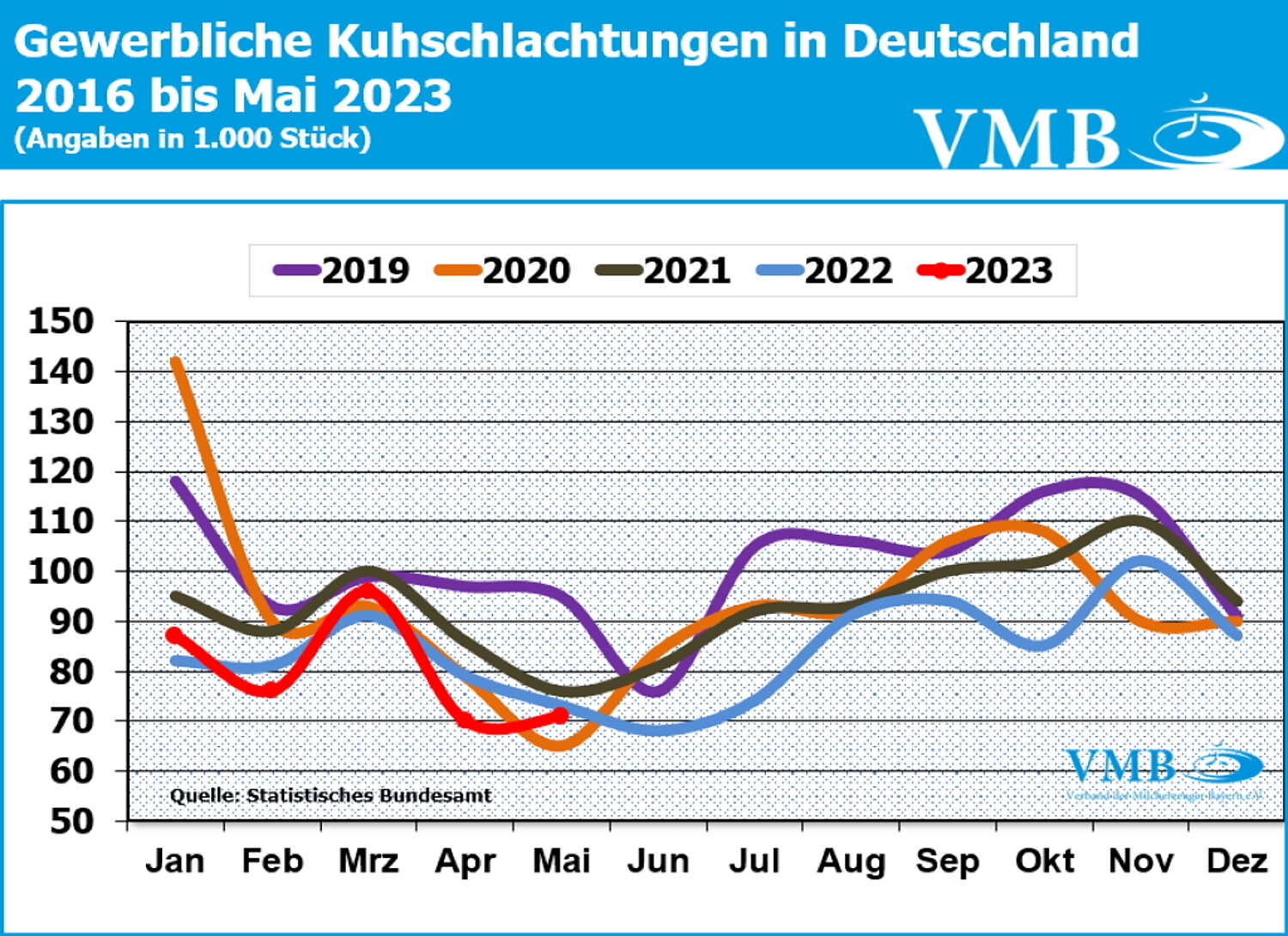 Das Statistische Bundesamt erhebt zeitnah allgemein die Schlachtzahlen in Deutschland. Auch Rinderschlachtungen bzw. hier die Kuhschlachtungen werden stetig neu herausgegeben. Die laufende Erhebung des Bundesamtes für Schlachtkühe in Deutschland bis Mai 2023 vermittelt eine sehr geringe Abgangszahl im Vergleich der letzten Jahre. Nur zum Coronajahr 2020 sind ähnliche Werte aufgetreten.