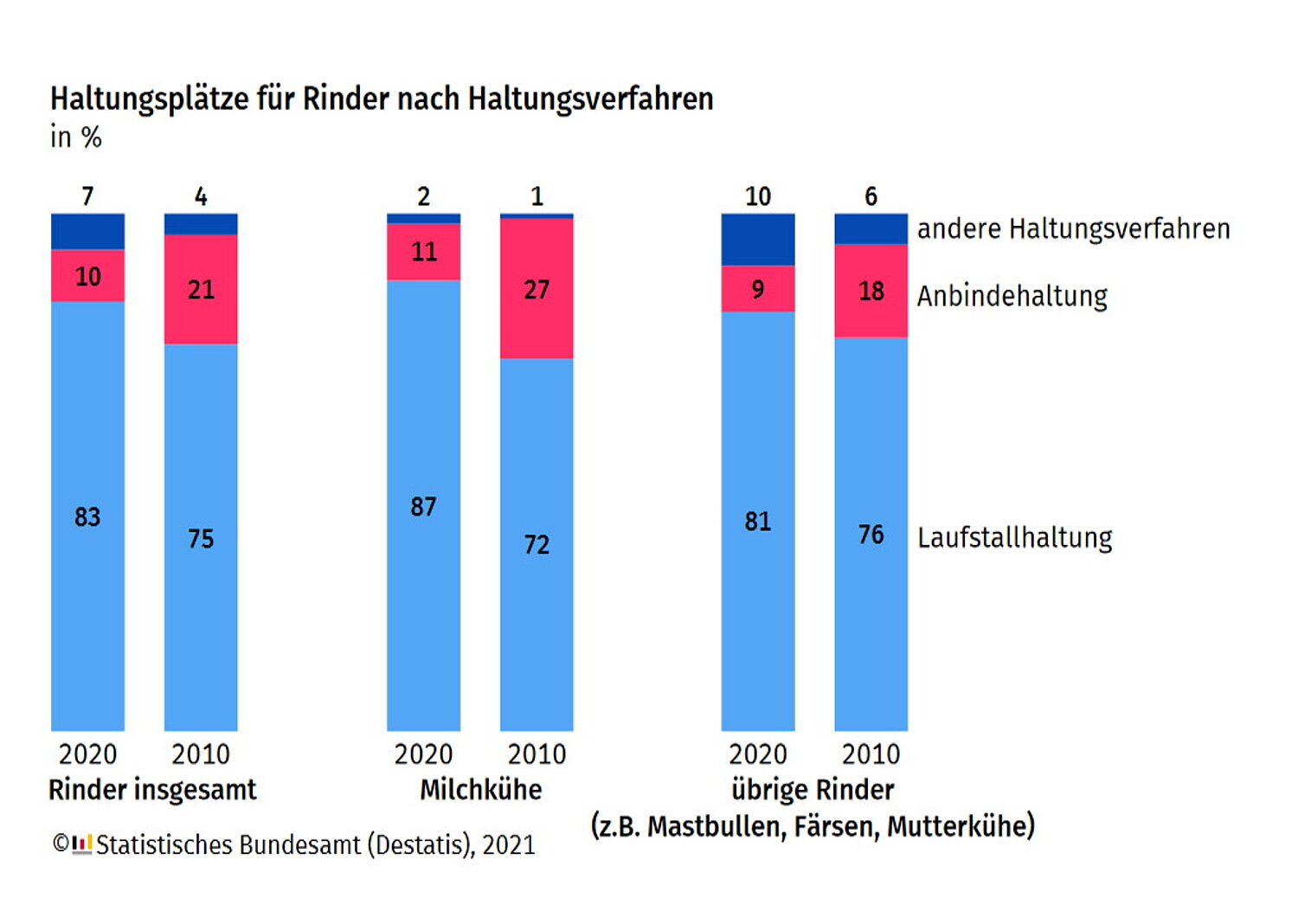 So wurden nach Angaben des statistischen Bundesamtes für die Haltung von Milchvieh, Mastbullen, Mutterkühen usw. auf landwirtschaftlichen Betrieben in Deutschland zum Stichtag 1. März 2020 insgesamt 11,4 Millionen Haltungsplätze registriert. Mit 83 Prozent aller Haltungsplätze war die Laufstallhaltung vorherrschend. Nur noch 10 Prozent aller Haltungsplätze für Rinder bundesweit befanden sich in Ställen mit Anbindehaltung. Weitere 7 Prozent der Haltungsplätze waren andere Verfahren, worunter auch die Haltung der Kälber in Iglus gezählt wird. Bei der Anbindehaltung gab es - wenig überraschend - im Vergleich zu 2010 einen deutlichen Rückgang um 62 Prozent auf noch rund 1,1 Millionen Haltungsplätze. Von den Betrieben mit Anbindehaltung hatten 52 Prozent auch Weidehaltung. In den anderen 48 Prozent der Betriebe mit dieser Haltungsform wurden die Rinder ganzjährig in Anbindehaltung gehalten.