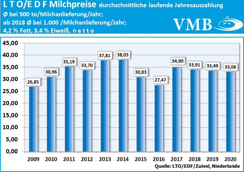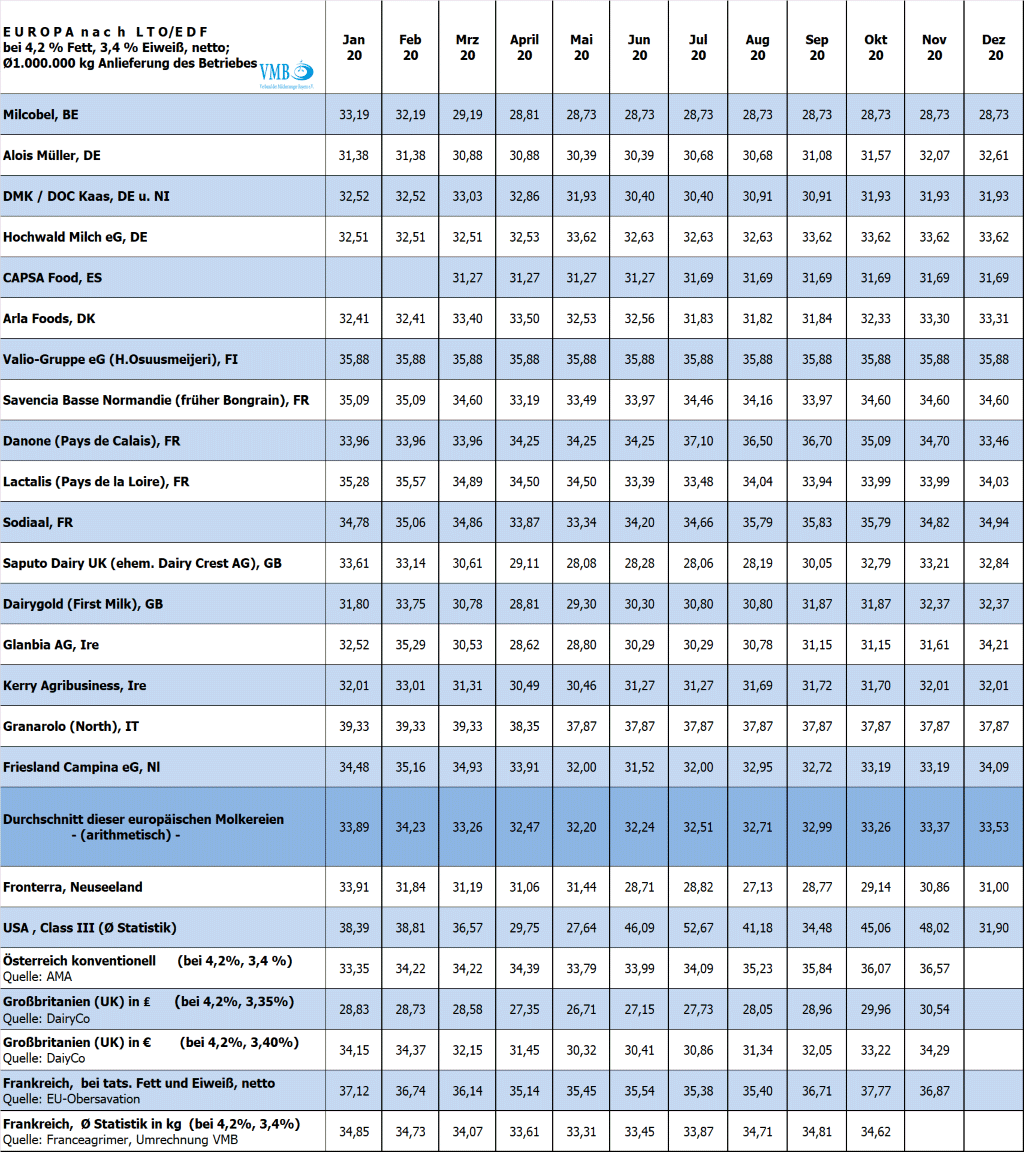 Der niederländische Bauernverband LTO ermittelt, in Zusammenarbeit mit Zuivel NL und der EDF (European Dairy Farmers), einen Gesamtmilchpreis der in Europa größten milchverarbeitenden Unternehmen. Zusätzlich werden von den Molkereileistungen Einzelauswertungen errechnet.