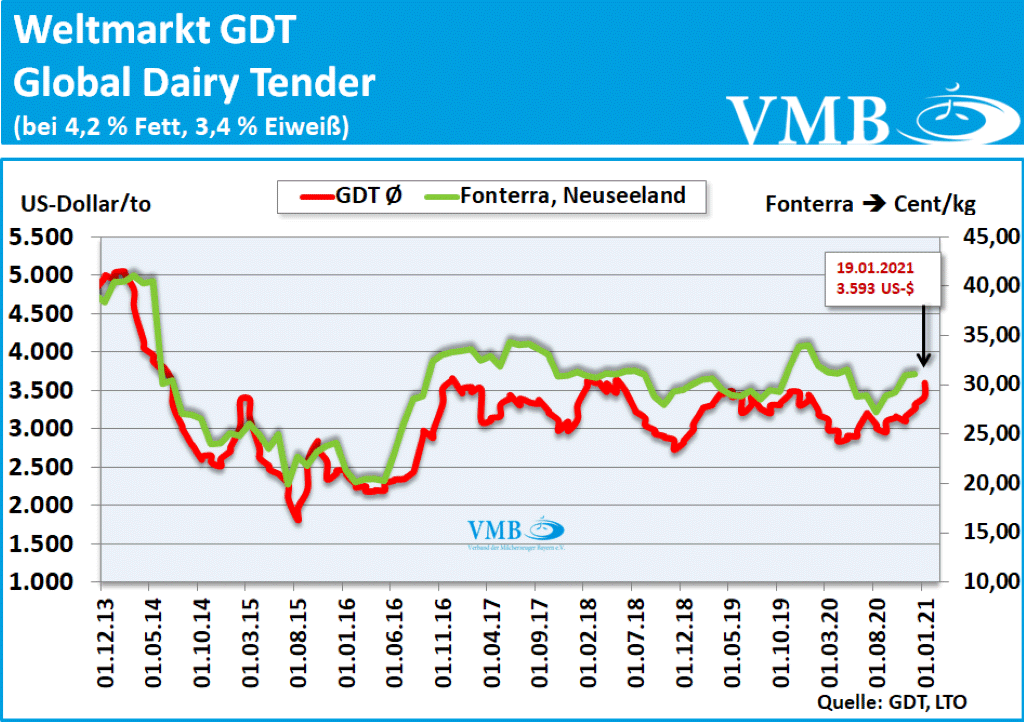 Stabil ist der Marktverlauf auf internationaler Ebene. Hier präsentieren sich die Preisentwicklungen in ihrer Ausrichtung stabiler und konstanter. Bei den letzten Auktionen des Global Dairy Trade Tenders, auch im neuen Jahr 2021, erfolgten ausgeglichene Preisanstiege. Demzufolge konnten sich die Milchpreise der neuseeländischen Fonterra, welche bekanntlich zu 95 Prozent am Weltmarkt ihre Milchprodukte verkauft, stetig erhöhen. Demzufolge befindet sich nun der Fonterra Milchpreis auf einer Höhe von 31,00 Cent pro Kilogramm Milch. Da die globalen Verkaufspreise auch im Jahr 2021 weiter voranschreiten werden, könnten die Auszahlungen in Neuseeland durchaus noch um einige Cent angehoben werden.
