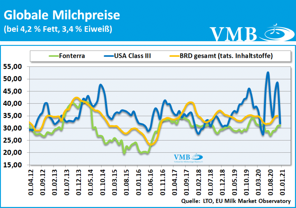 Die Milchpreisauszahlungen in Übersee haben sich für Käsemilch (Class III-Milk) im Kalenderjahr 2020 relativ impulsiv gestaltet. Die Corona-Krise hat in den Vereinigten Staaten die Verwertungen von Käse hin und her bewegt. Während im Frühjahr 2020 durch den Lockdown die Milcherfassung teilweise aussetzt wurde, haben die Verwertungen im 2. Halbjahr 2020 deutlich angezogen. Im Vergleich zu den letzten Jahren erweist sich die Schwankungsbreite als sehr – gegenüber den sonstigen Marktverläufen – unüblich. Die Preisschwankungen liegen im Jahr 2020 (sage und schreibe) bei 25 Cent, also zwischen 52,67 im Juli und 27,64 Cent pro Kilogramm Milch im Monat Mai 2020. Vom November zum Dezember 2020 hat sich der Preis allerdings um 16,32 Cent von 48,22 auf 31,90 Cent pro Kilogramm Milch reduziert.