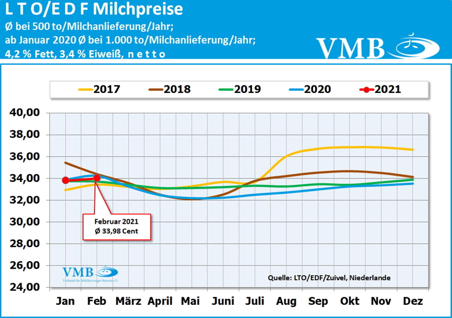 Der Bauernverband LTO aus den Niederlanden hat in seiner aktuellen Meldung wieder einen Anstieg des europäischen Durchschnittswertes bekanntgegeben. Seit dem Monat Mai 2020 ist der durchschnittliche europäische Milchpreis stetig angestiegen und hat nun im Monat Februar 2021 eine Höhe von 33,98 Cent pro Kilogramm Milch erreicht. Da die Milchpreishöhe des Vormonats Januar 2021 bei 33,77 Cent pro Kilogramm Milch lag, hat sich demzufolge der LTO-Milchpreis um 0,21 Cent pro Kilogramm Milch bzw. um Plus 0,6 Prozent erhöht.