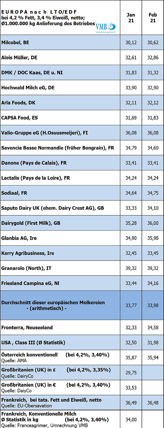 Der niederländische Bauernverband LTO ermittelt, in Zusammenarbeit mit Zuivel NL und der EDF (European Dairy Farmers), einen Gesamtmilchpreis der in Europa größten milchverarbeitenden Unternehmen. Zusätzlich werden von den Molkereileistungen Einzelauswertungen errechnet.