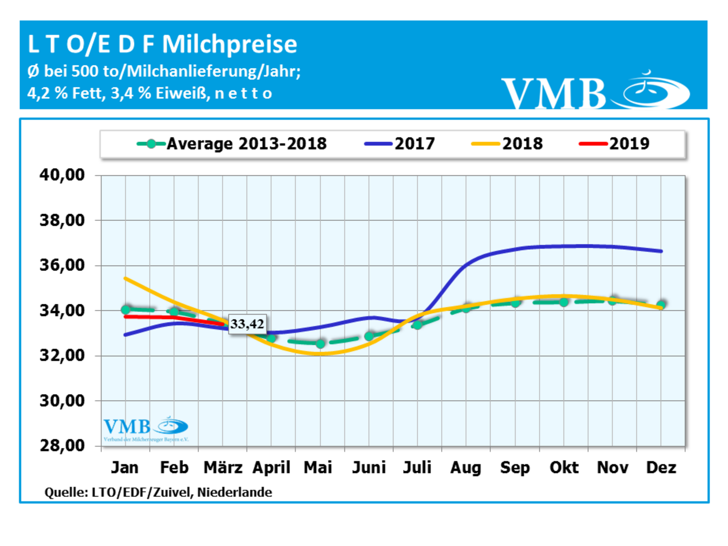 Nach den Auswertungen der drei Verbände, hat der Durchschnittspreis der europäischen Molkereien zum Ende des ersten Quartals 2109 eine leichte Festigkeit erreicht. Der errechnete Wert in Höhe von 33,42 Cent pro Kilogramm kommt fast an den Milchpreis des Vorjahresmonates heran. Obwohl im Durchschnitt der LTO-Wert um 3 Zehntel Cent bzw. um 0,9 Prozent zurückgegangen ist, zeigt bereits ein Großteil der aufgeführten Molkerei einen, im Vergleich zum Vormonat, unveränderten Auszahlungspreis. (Die genannten Milchpreise gelten für 4,2 % Fett und 3,4 % Eiweiß, netto, ab Hof, bei einer durchschnittlichen Erzeugungsmenge pro Betrieb von 500.000 Kilogramm Milch pro Jahr).