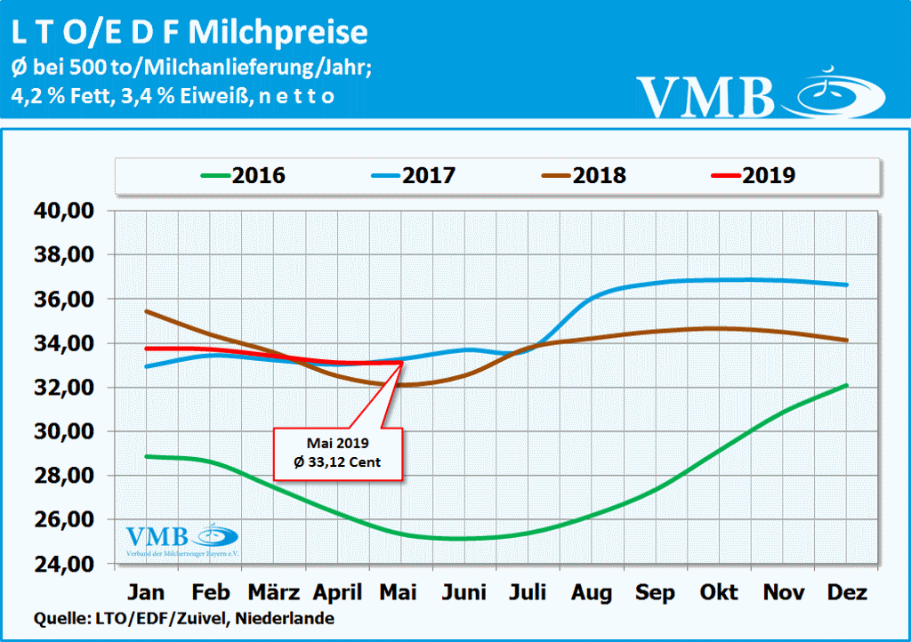 Nach Auswertungen des niederländischen Bauernverbandes LTO hat sich der durchschnittliche Wert, der in Europa größten Milchverarbeiter, im Monat Mai 2019 gegenüber dem Vormonat nicht mehr verändert. Somit liegt der errechnete Durchschnittspreis ebenfalls bei 33,12 Cent pro Kilogramm Milch. (Die aufgeführten Milchpreise gelten für Milch mit 4,2 % Fett und 3,4 % Eiweiß, netto, ab Hof, bei einer durchschnittlichen Erzeugungsmenge 500.000 kg pro Betrieb).