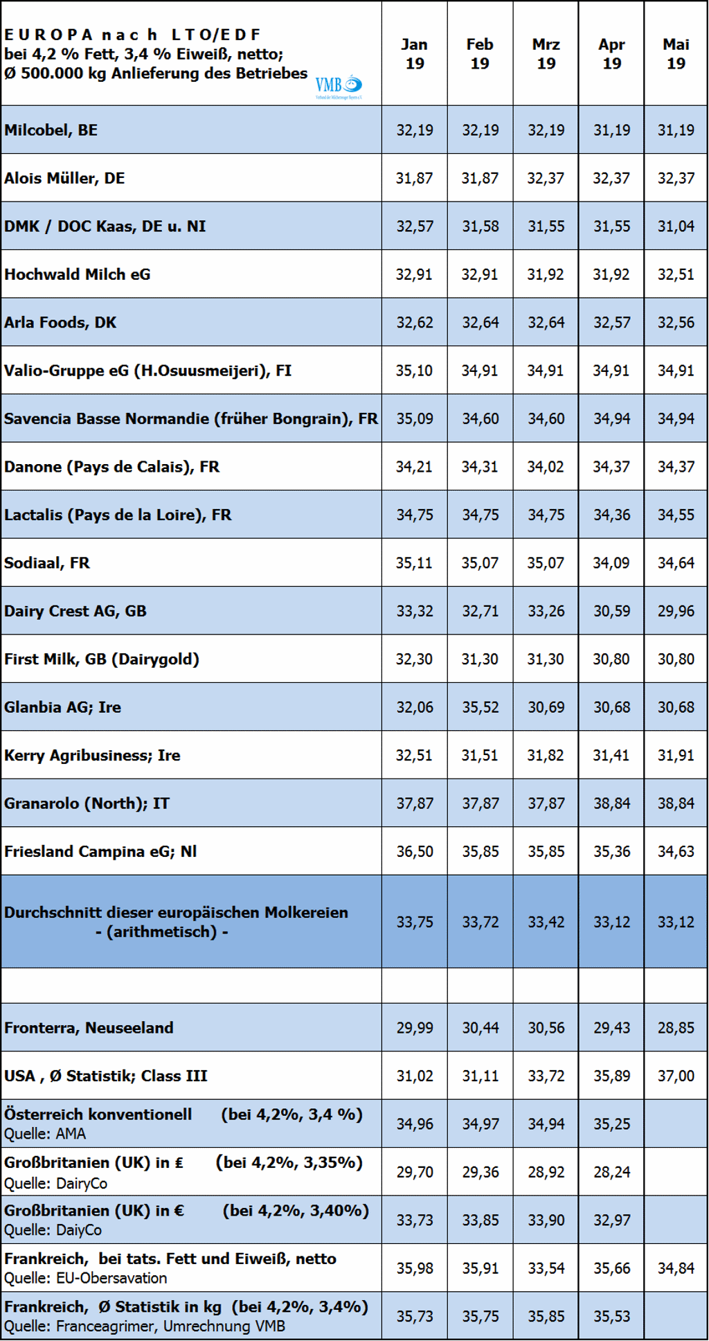 Die Milchpreisspanne, der in Europa größten Milch verarbeitenden Molkereien, liegt nach Berechnung des niederländischen Bauernverbandes LTO zum größten Teil zwischen 30 und 35 Cent. Daraus ergibt sich, dass die Milchauszahlungspreise der einzelnen Molkereien sich fast auf dem errechneten europäischen Mittelwert bewegen. Sollten die Milchauszahlungspreise sich im Monat Juni 2019 in ähnlicher Weise entwickeln, kann mit einem durchschnittlichen Halbjahresmilchpreis von knapp 33,5 Cent pro Kilogramm Milch gerechnet werden.