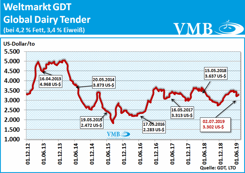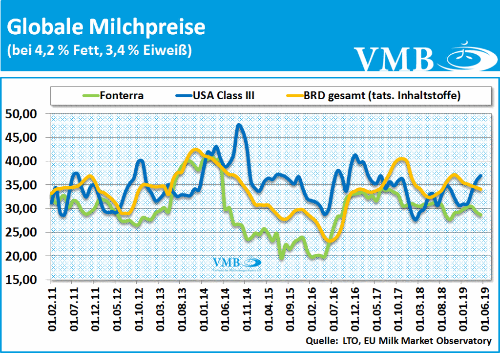 Nach der Erhebung der LTO, deuten bislang die Milchpreisentwicklungen auf anderen Kontinenten ebenso auf differenzierte Verhältnisse hin, wie der Milchpreisspiegel auf europäischer Ebene. Während bei der Class III Milch in Amerika eine Milchpreisstabilität mit einer weiteren Erhöhung zu erkennen ist, liegt das Milchpreisniveau der neuseeländischen Fonterra im Monat Mai 2019 leicht unter den Werten des Vormonats. Mit 28,85 Cent zahlt Fonterra über einen halben Cent weniger Milchgeld als im vergangenen Monat. Ursache dieser Korrektur könnten die letzten beiden Auktionen des GDT-Tenders sein. Generell weisen allerdings auch die globalen Handelsmärkte ein weitgehend stabiles Milchpreisniveau in der Größenordnung der europäischen Börsennotierungen auf.