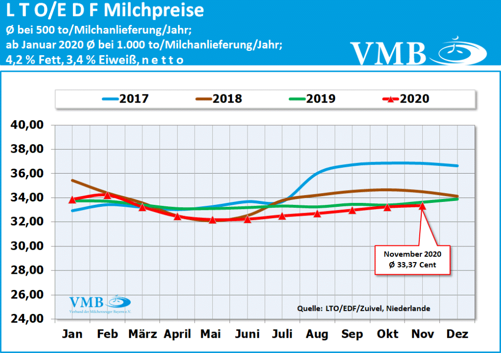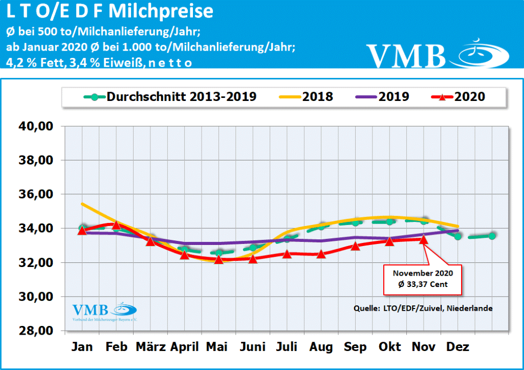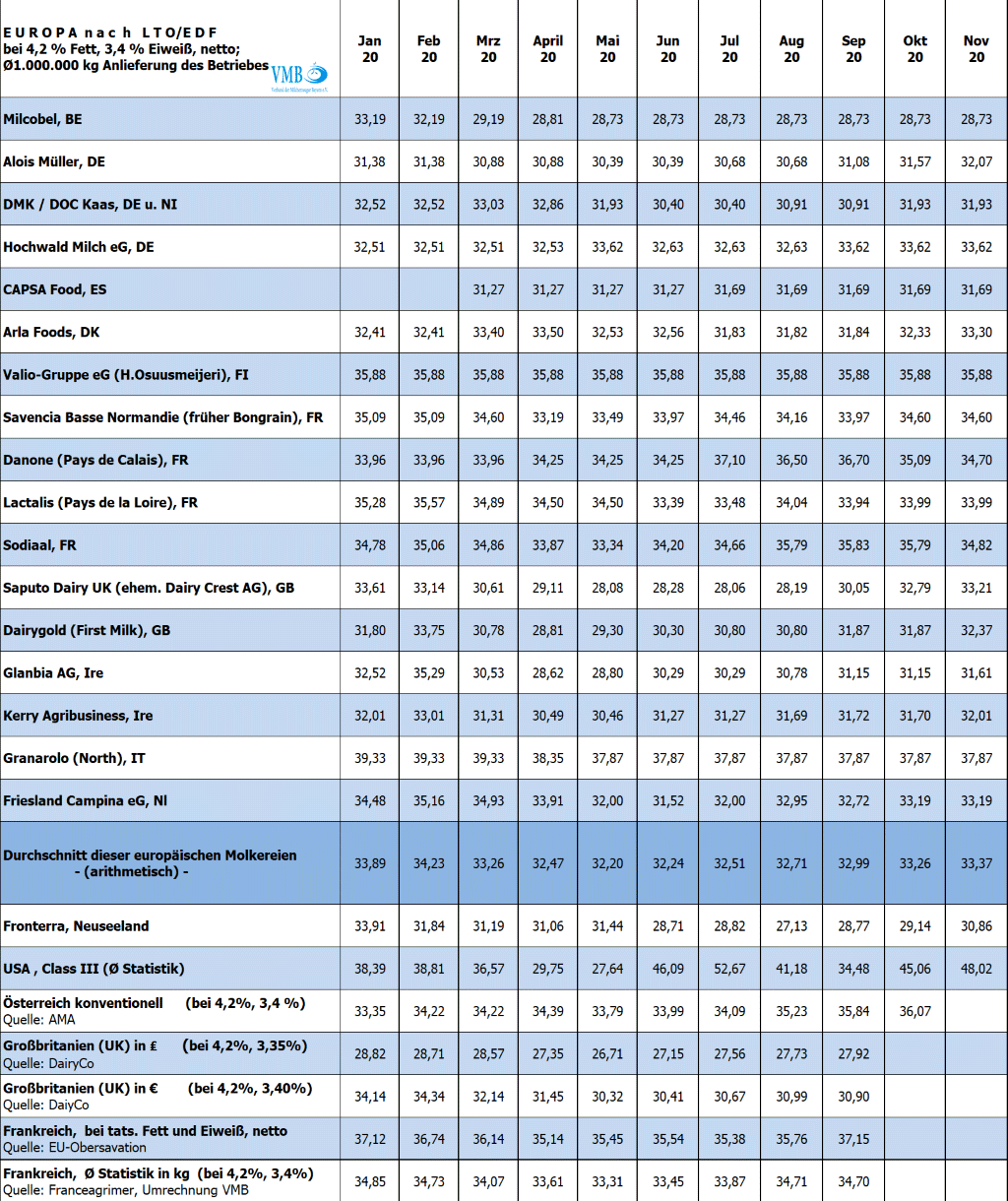 Die Entwicklung des europäischen LTO-Durchschnittsmilchpreises offenbart, dass bereits im Juli 2020 sich die Märkte wieder gefestigt haben und infolgedessen auch die Verwertungen der Molkereien merklich angehoben wurden. Seit Juni 2020 hat sich der durchschnittliche EU-Milchpreis um über einen Cent verbessern können. Auch im Monat November 2020 haben fast alle europäischen milchwirtschaftlichen Unternehmen noch einmal ihre Auszahlungsleistungen erhöht. Jedoch bleibt immer noch ein kleiner Abstand gegenüber dem Vorjahresmonat.