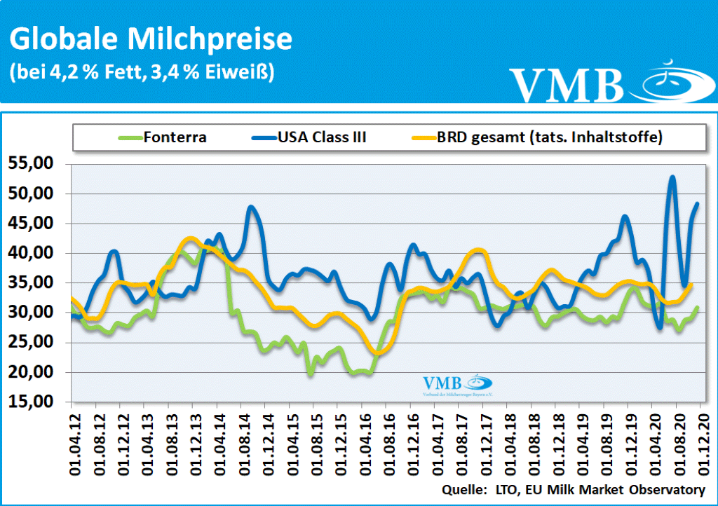 Betrachtet man die aktuellen Verwertungschancen im globalen Handel, so ist zu beobachten, dass die Geschäfte mit Milchprodukten besser voranschreiten als die Absatzmöglichkeiten in den heimischen Regionen. Aufgrund der anziehenden globalen Milchpreisen, hat auch die neuseeländische Fonterra optimistischer die Vermarktungsposition bewertet und für den November 2020 einen Milchpreis von fast 31 Cent festgelegt. Somit ergibt sich gegenüber dem Vormonat ein Plus von gut 1,75 Cent. Gleichzeitig sind die Verwertungsoptionen im Käsebereich in den Vereinigten Staaten, trotz der politischen Unruhen, besser geworden. Der Preis der Class III Milch hat im Käsesektor inzwischen eine sehr hohe Position von über 48 Cent erreicht. Allerdings darf man diesen Wert nur bedingt als Gesamtauszahlungsleistung ansehen, da die anderen Verwertungen im Bereich Frische und Fett in Amerika deutlich niedriger liegen. Bei der letzten GDT-Auktion hat sich gezeigt, dass durchaus im Pulver-, Käse- und auch Milchfettbereich höhere Forderungen umgesetzt werden konnten. Ausgehend vom Trend des 2. Halbjahres 2020, ist die Marktentwicklung freundlicher einzustufen. Jedoch bleibt abzuwarten, wie die Weltgemeinschaft im Jahr 2021 die Corona-Pandemie meistern wird und dies die Entwicklung der Märkte beeinflusst.