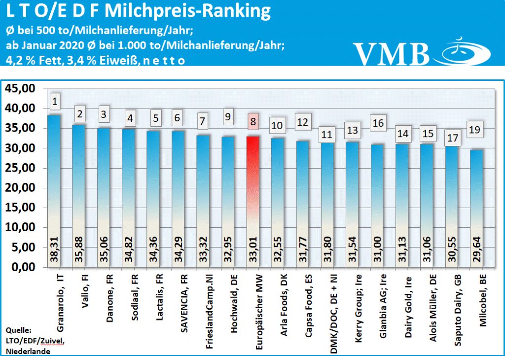 Der niederländische Bauernverband LTO ermittelt, in Zusammenarbeit mit Zuivel NL und der EDF (European Dairy Farmers), einen Gesamtmilchpreis der in Europa größten milchverarbeitenden Unternehmen. Zusätzlich werden von den Molkereileistungen Einzelauswertungen errechnet.