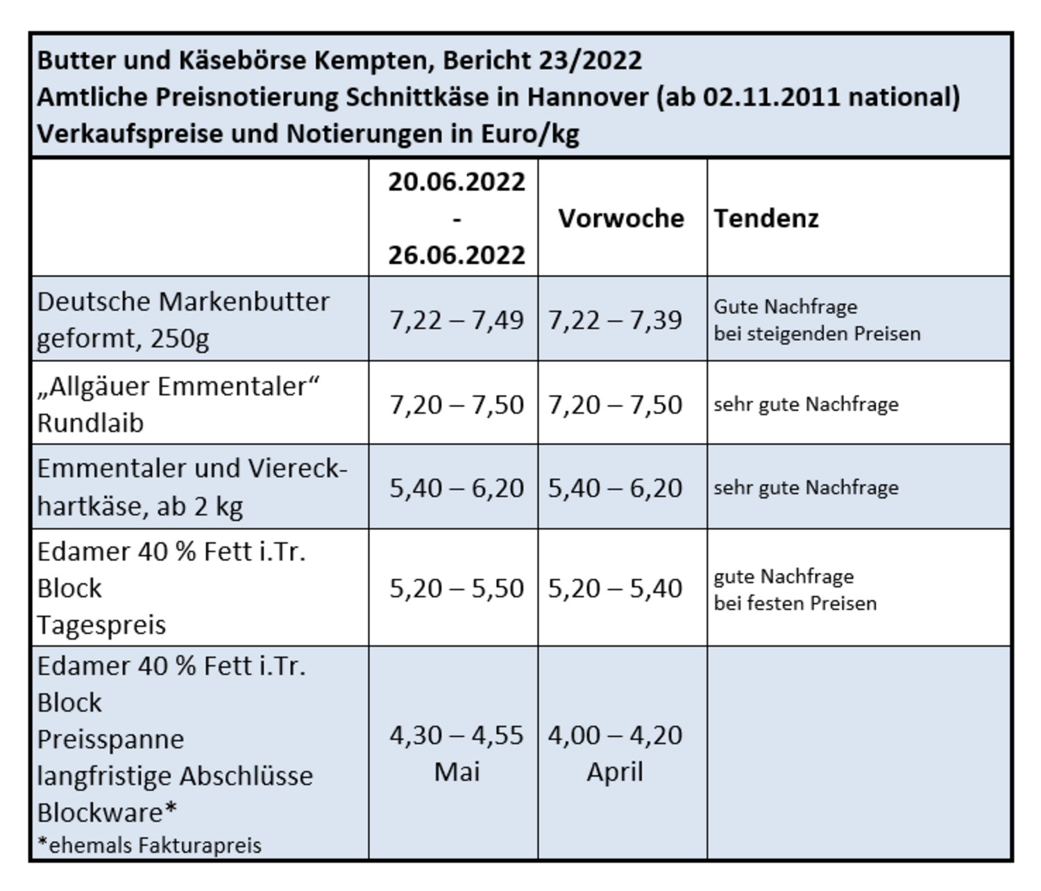 Die Konsumentwicklung bei Schnittkäse verbleibt weiterhin günstig. In den Sorten Edamer und Gouda als auch Tilsiter und Butterkäse werden rege Vermarktungsmöglichkeiten gemeldet. Zunehmend werden durch die beginnenden Schulferien hierzulande die Anfragen aus dem Ausland - vor allem der Anrainerstaaten im Mittelmeerraum – größer, da die Reisetätigkeiten zugenommen haben. Die Käseerzeugung ist allgemein durch die rückläufige Milchanlieferung in Deutschland verhaltener, sodass sich durch eine sehr ausgeglichene Marktposition der Verarbeiter, feste Preise benennen lassen.