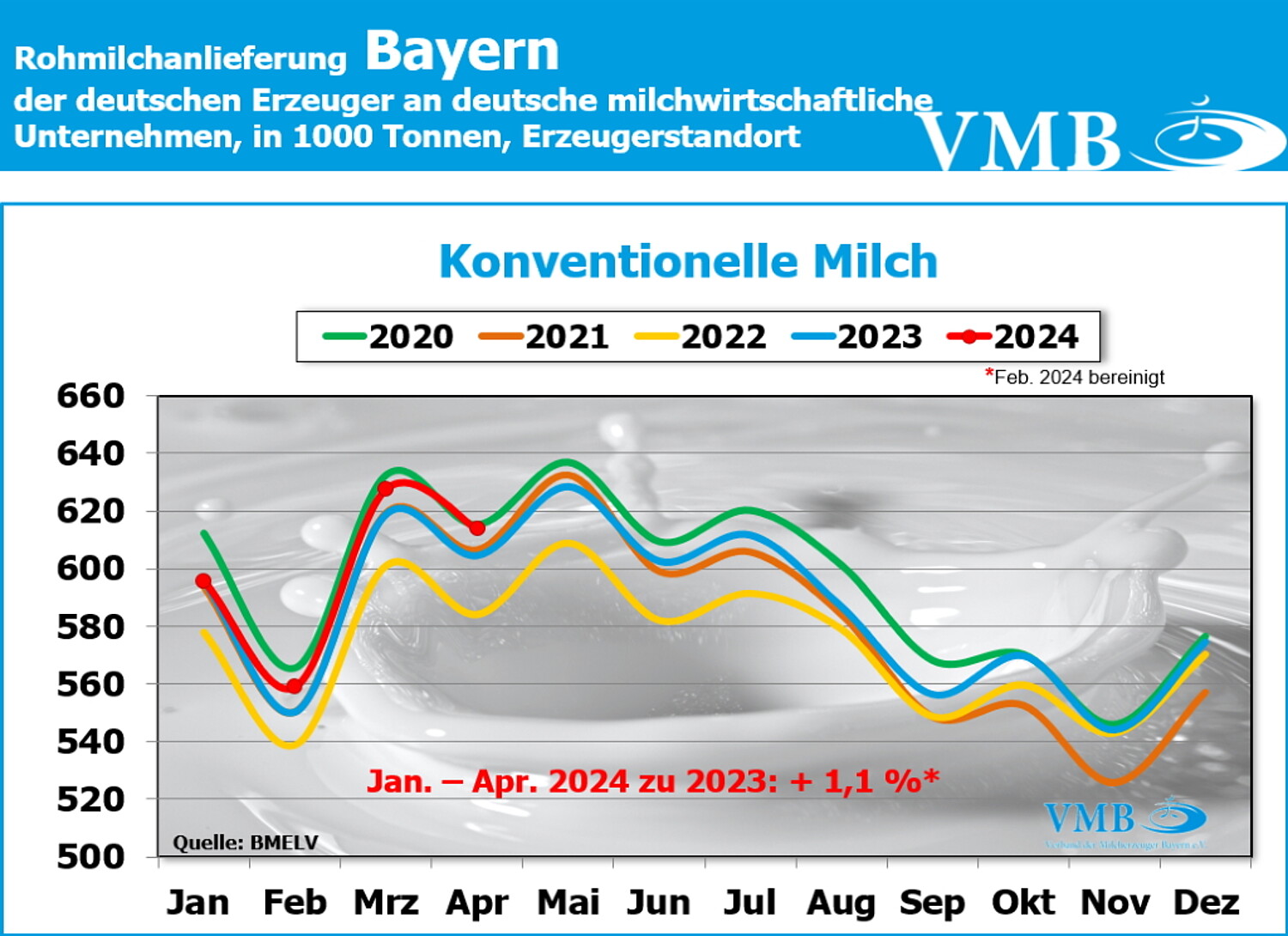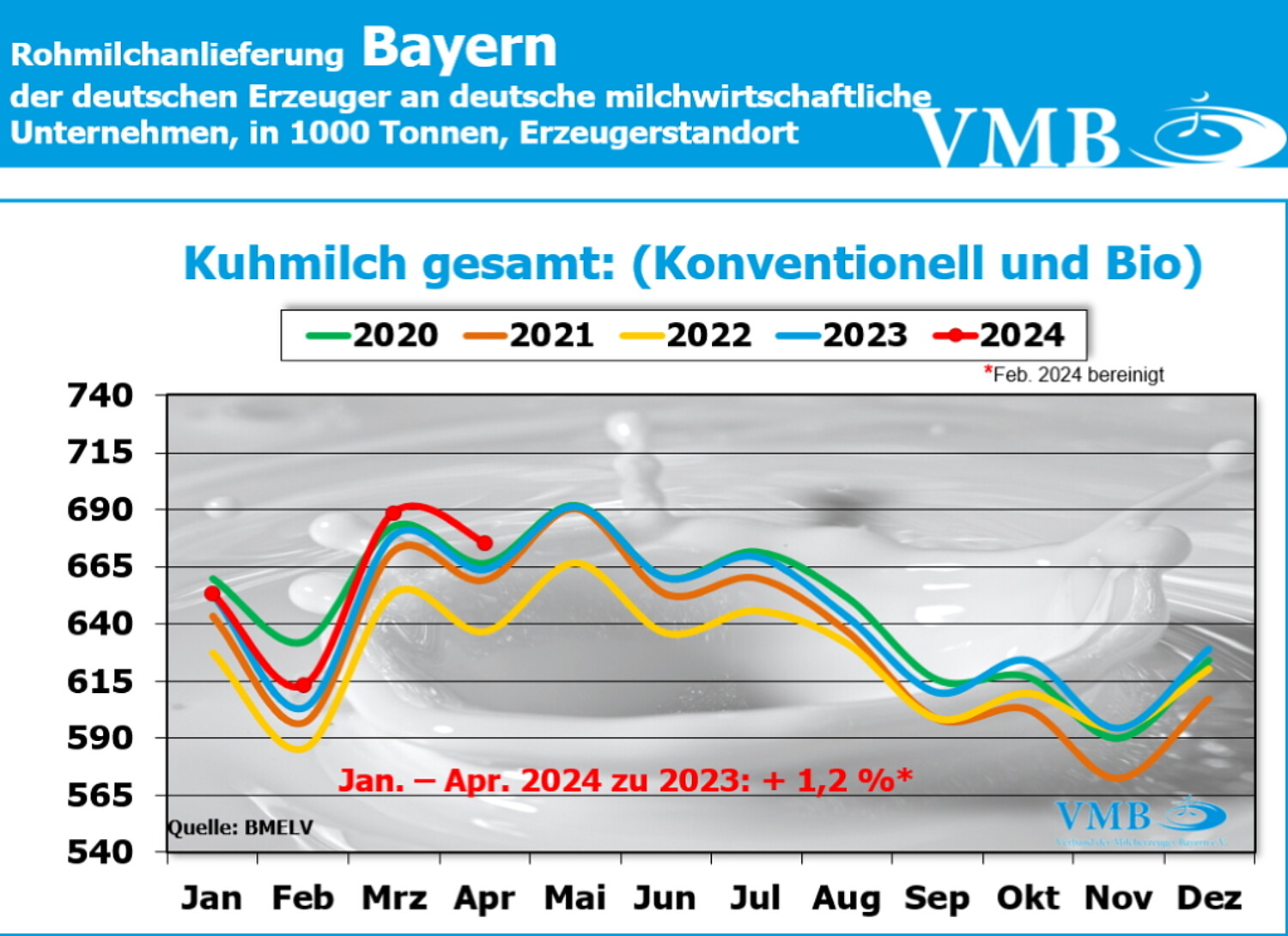 Im Bereich der Bio-Milcherzeugung setzte sich im Bundesgebiet die zunehmende Anlieferung aus dem Vormonat fort und gewann an weiterer Dynamik. Das Angebot an ökologisch/biologisch erzeugter Milch erhöhte sich im April um 2,8 % auf 123,6 Millionen Kilogramm gegenüber dem Vorjahresmonat. Im bedeutendsten Erzeugungsland Bayern - rund 50 % der bundesweiten Biomilch werden hier erzeugt – legte das Milchaufkommen im April um 3,8 % auf 61,64 Millionen Kilogramm gegenüber dem Vorjahresmonat zu. Eine ähnliche Entwicklung war auch in Baden-Württemberg mit einem Plus von 3,8 % feststellbar. Relativ betrachtet war in Niedersachsen der Anstieg der Bio-Milcherzeugung mit 6,3 % mit am stärksten ausgeprägt.