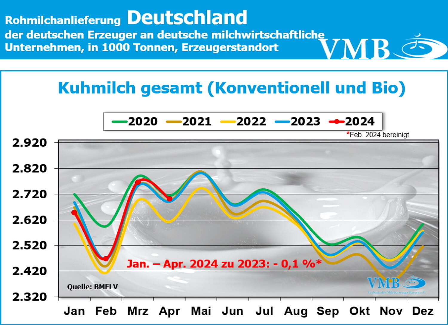 Das Milchaufkommen in Deutschland bewegte sich im April leicht über dem Vorjahresniveau. Der Bundesanstalt für Landwirtschaft und Ernährung (BLE) wurden mit insgesamt 2,701 Milliarden Kilogramm Milch 0,4 % mehr Milch (konventionelle und bio-/ökologischer Milch) gemeldet als im April des vergangenen Jahres. Relativ betrachtet, verzeichnete die Bio-Milcherzeugung einen stärkeren Zuwachs als die konventionelle Milcherzeugung. In Summe der ersten vier Monate (schalttagsbereinigt) liegt das Milcherzeugungsniveau des laufenden Jahres nahezu gleich auf mit der vergleichbaren Vorjahresmenge.