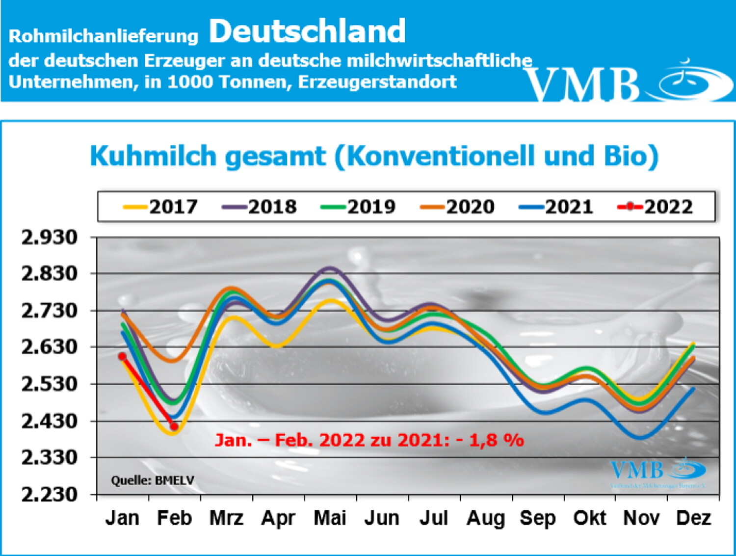 Die Statistik der deutschen Milchanlieferungsmenge, bekanntgegeben von der Bundesanstalt für Landwirtschaft und Ernährung (BLE), zeigt, wie bereits im laufenden Jahr 2021 zu Jahresbeginn 2022 einen weiteren Rückgang in der Milcherzeugung im konventionellen und ökologisch/biologischen Bereich. Das veröffentlichte Milchaufkommen für den Februar beträgt 2,414 Milliarden Kilogramm. Der Rückgang zum Vorjahresmonat liegt, mit einem Mengendefizit von etwas mehr als 36 Millionen Kilogramm Milch, bei einem Minus von 1,15 Prozent.