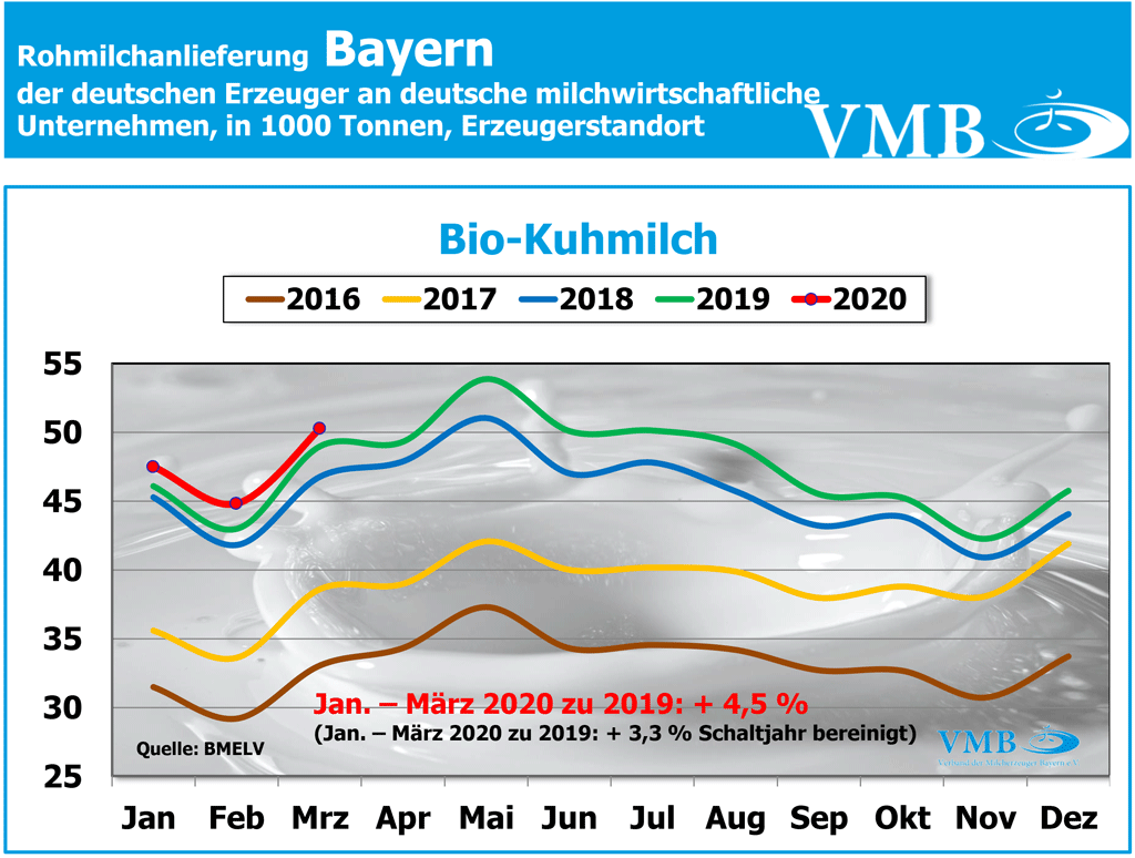 Die Bio-Milcherzeugung in Bayern folgt in gleicher Weise dem deutschen Trend, allerdings sind die prozentualen Abstände zu den vergleichbaren Vorjahren in der Höhe etwas geringer. Im weißblauen Bundesland sind im März 2020 über 50 Millionen Kilogramm Bio-Milch erzeugt worden. Also zirka 1,5 Millionen Kilogramm mehr Milch bzw. Plus 2,6 Prozent. Die dreimonatige kumulative Menge beträgt 144,2 Millionen Kilogramm Milch und damit ein Plus von 4,5 Prozent. Würde man den Schalttag herausrechnen, so würde sich bei einer Gesamtmilchmenge von etwas mehr als 142 Millionen Milch, ein Plus von 3,3 Prozent ergeben