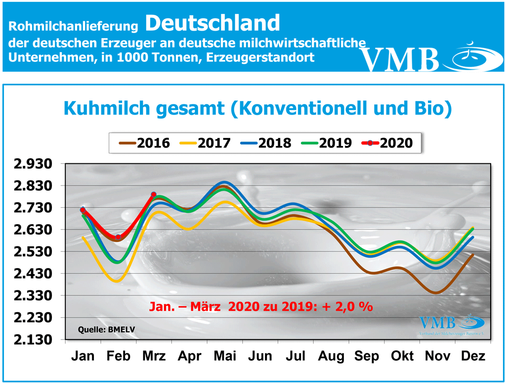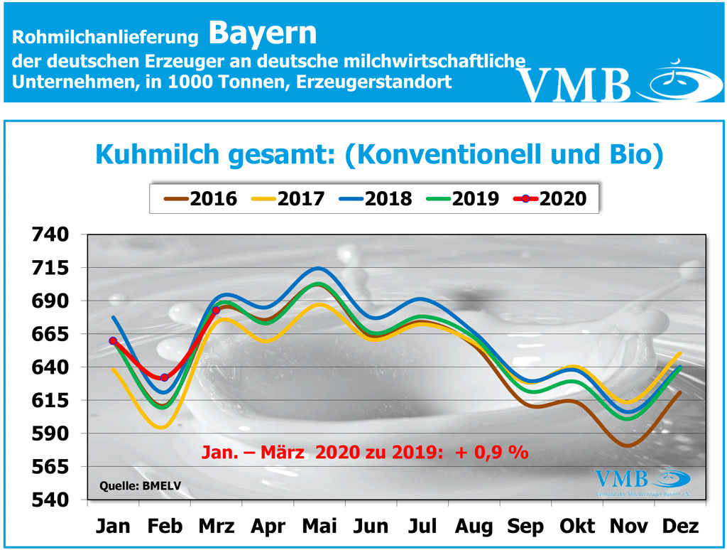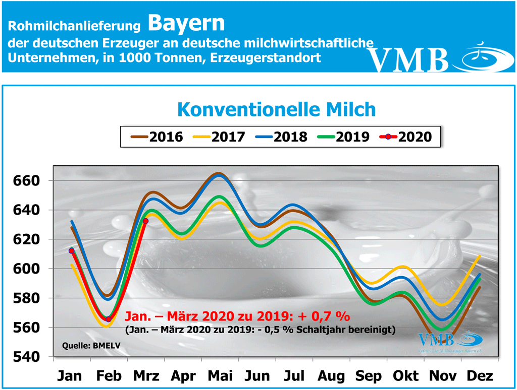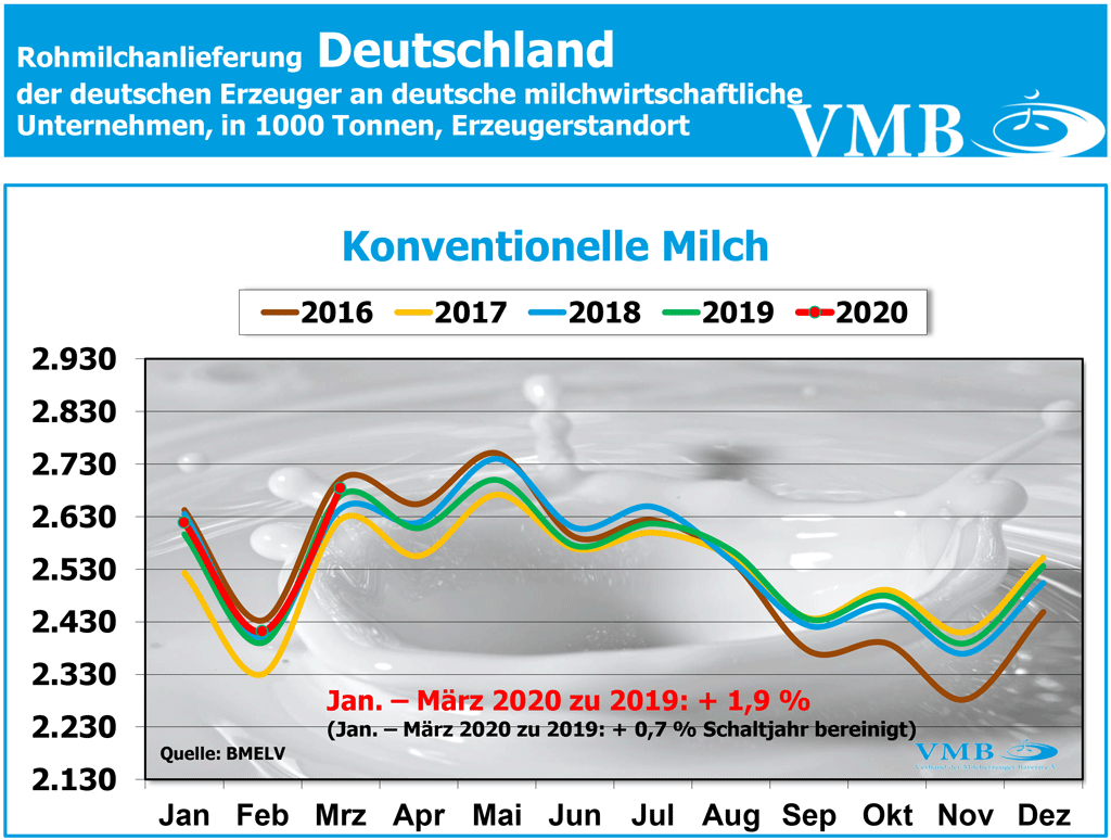 Die Gesamtmilchmenge der konventionell erzeugten Milch des ersten Jahresquartals 2020, beträgt 7.798,7 Milliarden Kilogramm (inklusive des Schalttages). Somit liegt die Gesamtmilchanlieferung um knapp 142 Millionen Kilogramm bzw. um 1,9 Prozent höher als im vergangenen Jahr. Korrigiert man zur besseren Vergleichbarkeit der Zahlen, den Schalttag des Februars 2020, so ergeben sich 7,712 Milliarden Kilogramm Milch. Dieses Endergebnis zeigt eine Steigerung der Milchmenge von14,2 Millionen Kilogramm bzw. von 0,7 Prozent gegenüber dem Jahr 2019 an.