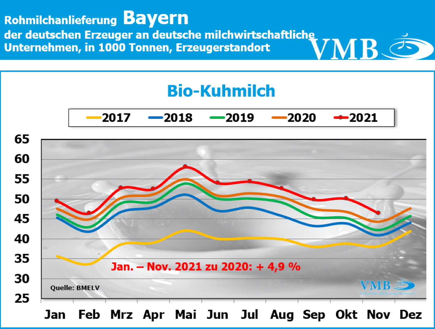 Der deutsche Milchanlieferungstrend ist auch bei der Betrachtung der Milcherzeugungsstatistik in den einzelnen Bundesländern festzustellen. Ohne Ausnahme ist in jedem Bundesland die monatliche Milchmenge zurückgegangen. Die Bandbreite des Rückgangs befindet sich dabei zwischen Minus zwei Prozent in Sachsen und fast acht Prozent in Thüringen. In Bayern reduzierte sich die Milchmenge im November um 3,7 Prozent auf 526 Millionen Kilogramm Milch. Demzufolge wird aller Voraussicht nach die Sieben-Millionen-Grenze in Bayern nicht mehr erreicht. Somit wird trotz den noch steigenden bayerischen Bio-Milchmengen das Ergebnis des Vorjahres nicht mehr erzielt werden.