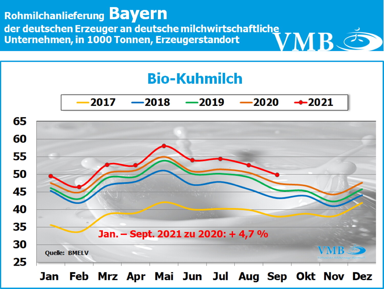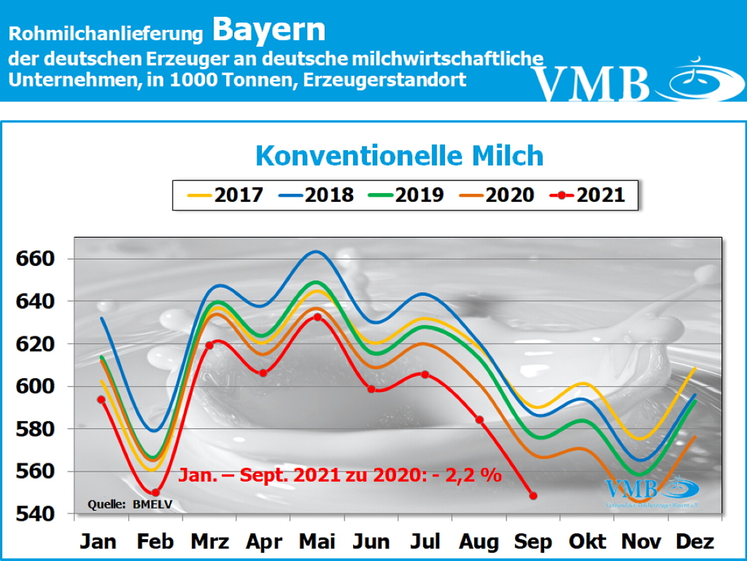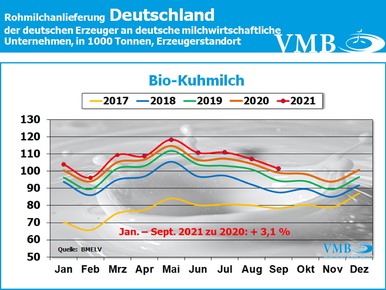 Anmerkung: Allerdings muss bei den Werten des Monats September 2021 noch berücksichtigt werden, dass aufgrund der neuen Milchgüteverordnung, die Umrechnung bei der Milcherfassung von Volumen auf Gewichteinheiten, in fast ganz Deutschland auf den Faktor 1,03 umgestellt worden ist. Dies bedeutet, die Milchanlieferungsmenge in Volumen gemessen, erhöht sich in Kilogramm umgerechnet, um knapp ein Prozent.